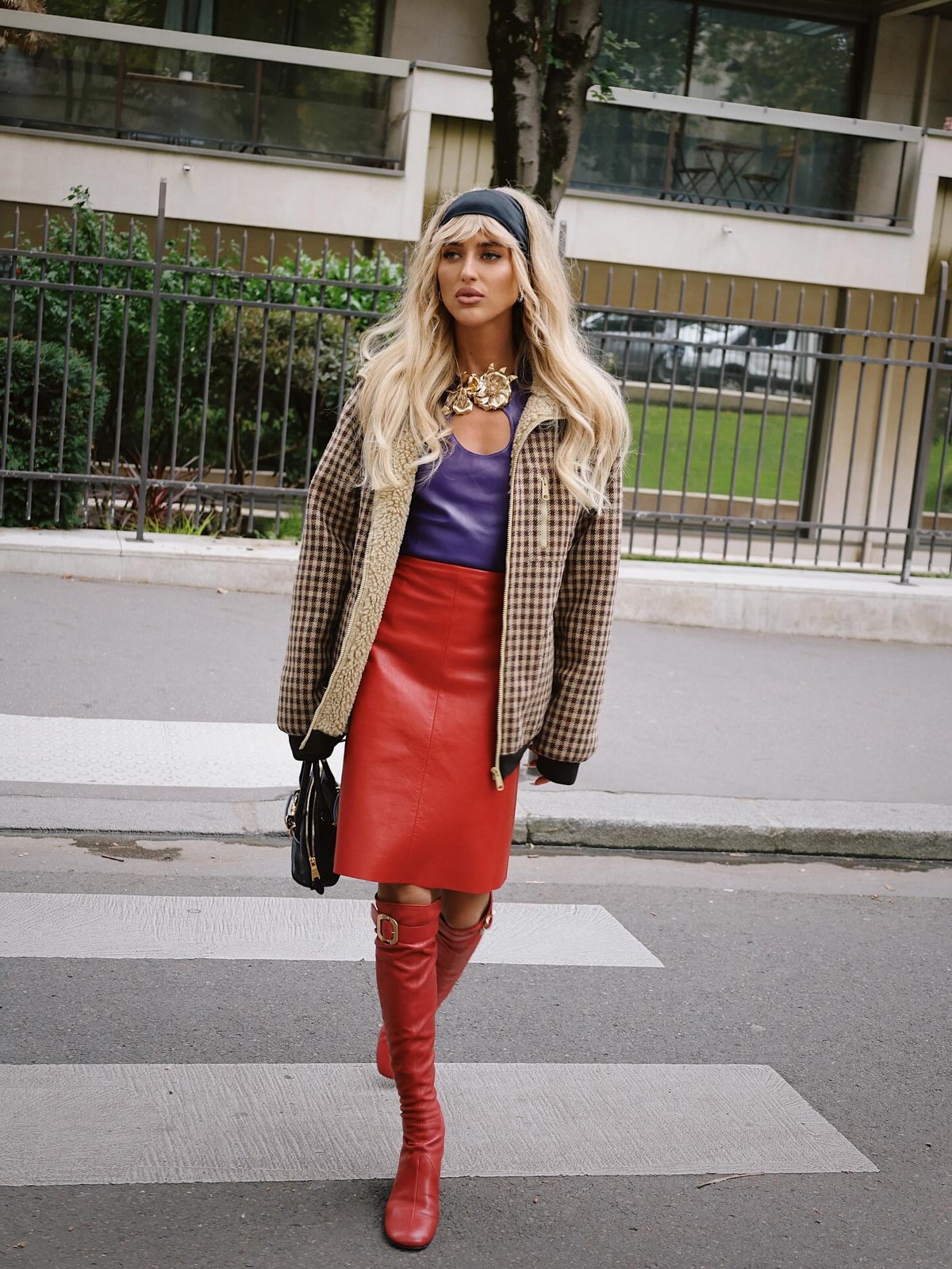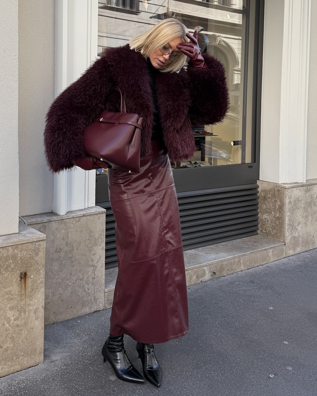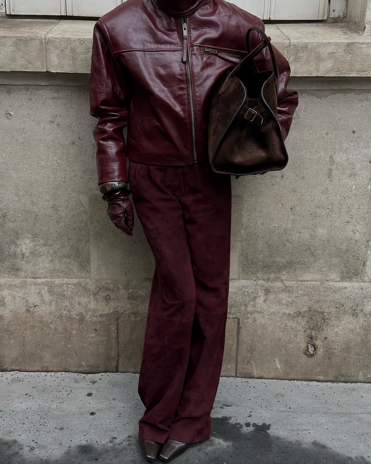 Особенно актуальны матовые текстуры, лакированная и цветная кожа. Цветовая палитра варьируется от классического черного и карамельного до насыщенного красного и винного. Кожа отлично комбинируется с шерстью, мехом и денимом, создавая сложные, но гармоничные многослойные образы.