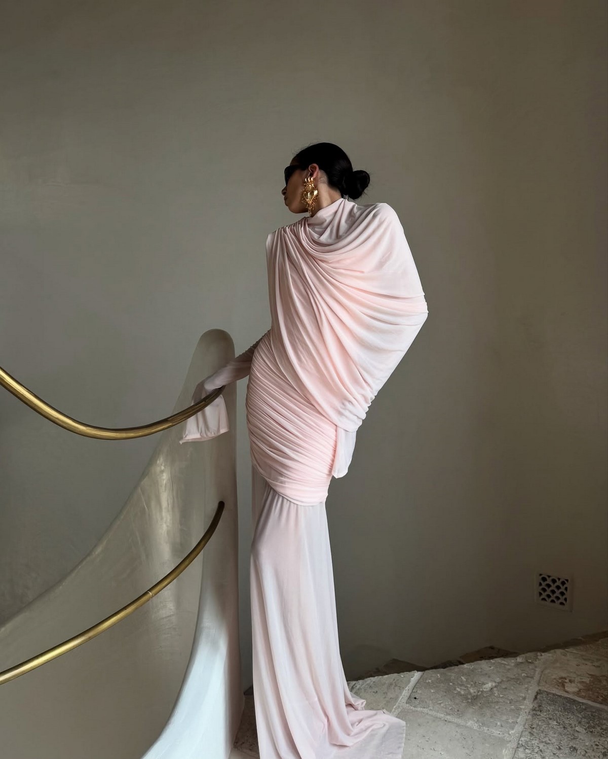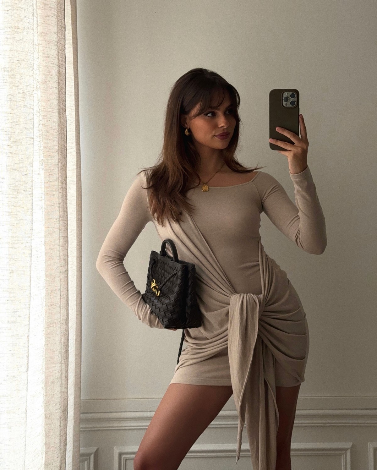 Драпировки возвращаются как главный элемент выразительности и динамики. Они украшают платья, юбки, свитеры и даже верхнюю одежду, создавая эффект «живой ткани». В этом сезоне драпированные элементы особенно красиво смотрятся в плотных трикотажах и шерстяных материалах.