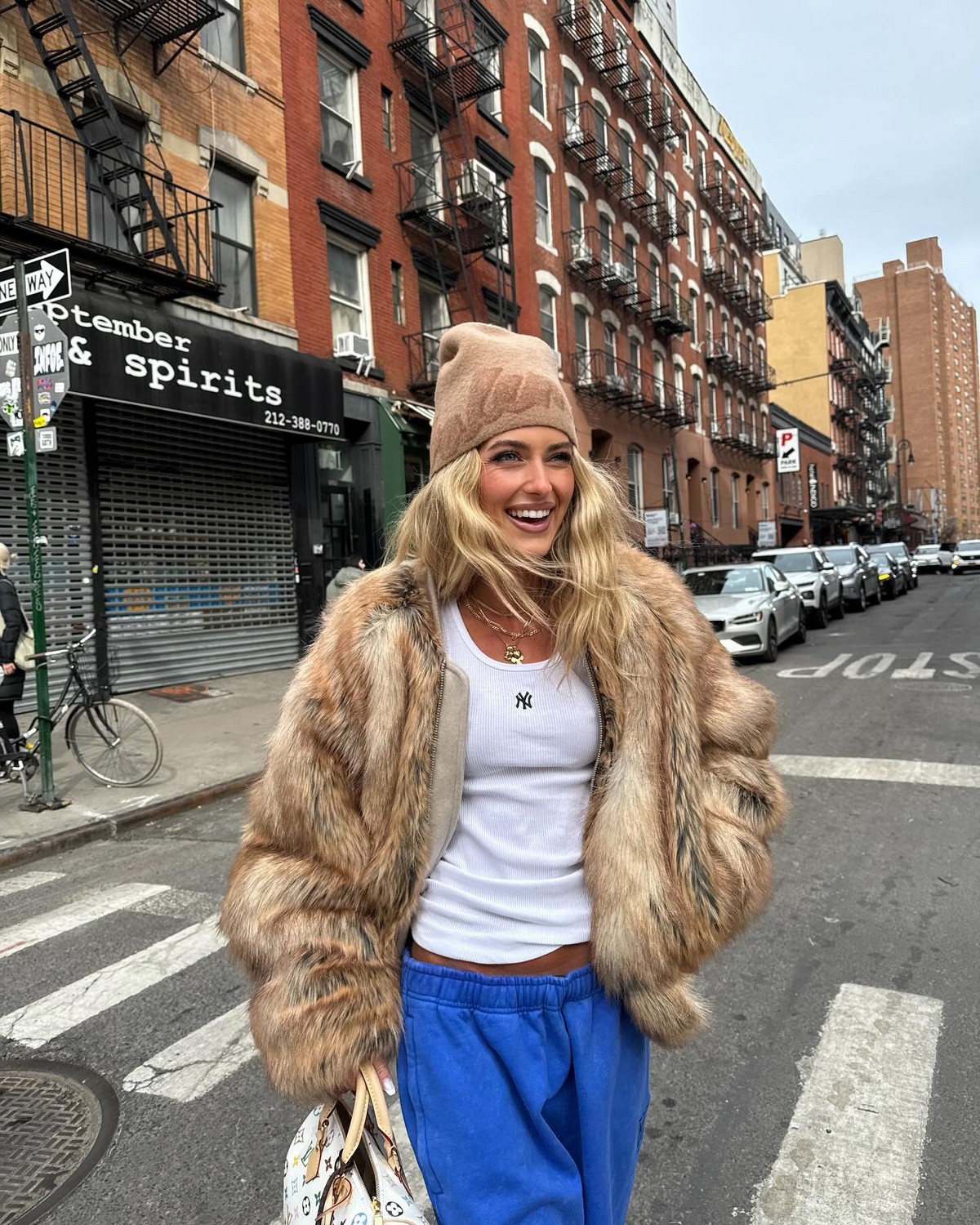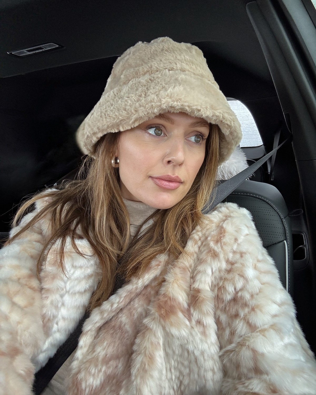 - Шапки и капоры отлично комбинируются с объемными пуховиками и шубами-тедди.