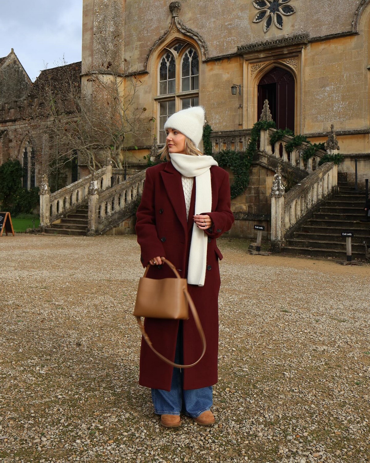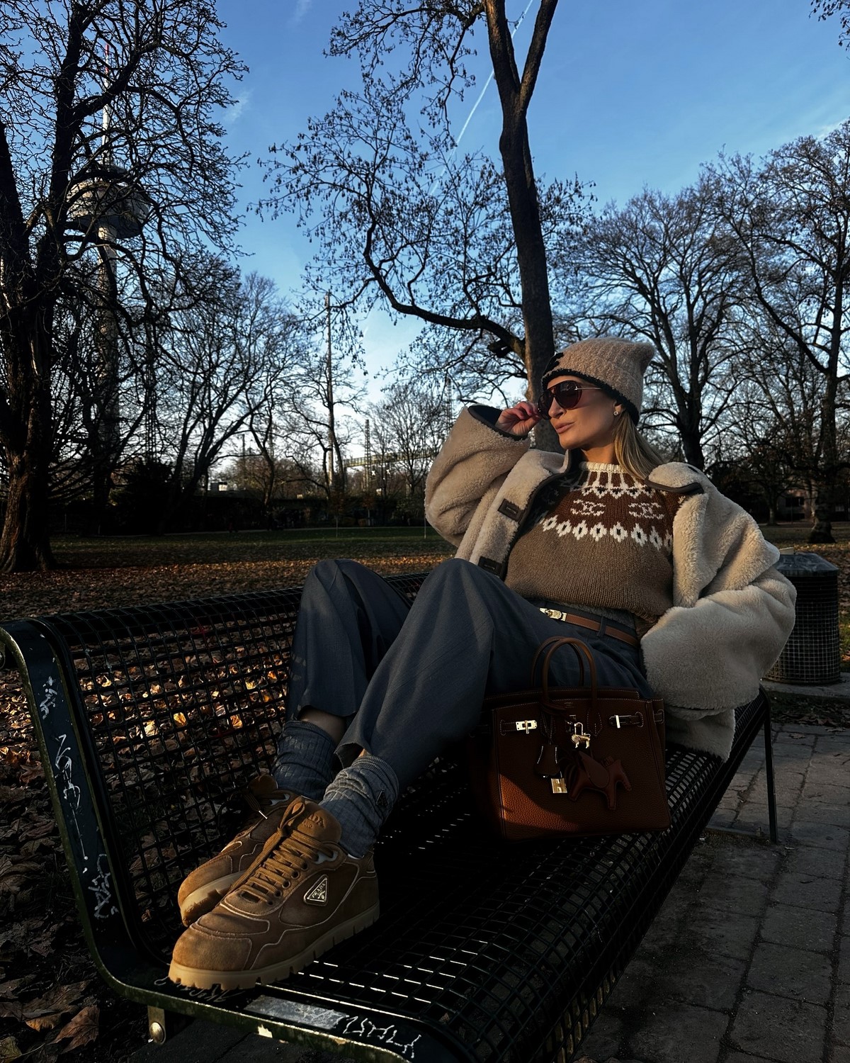 Шапка-бини — универсальный фаворит сезона. В 2025-2026 году актуальны модели с крупной вязкой, из кашемира или шерсти альпака. Их носят немного спущенными, создавая расслабленный силуэт. Отлично смотрятся в повседневных луках с дубленками, парками и объемными пальто.