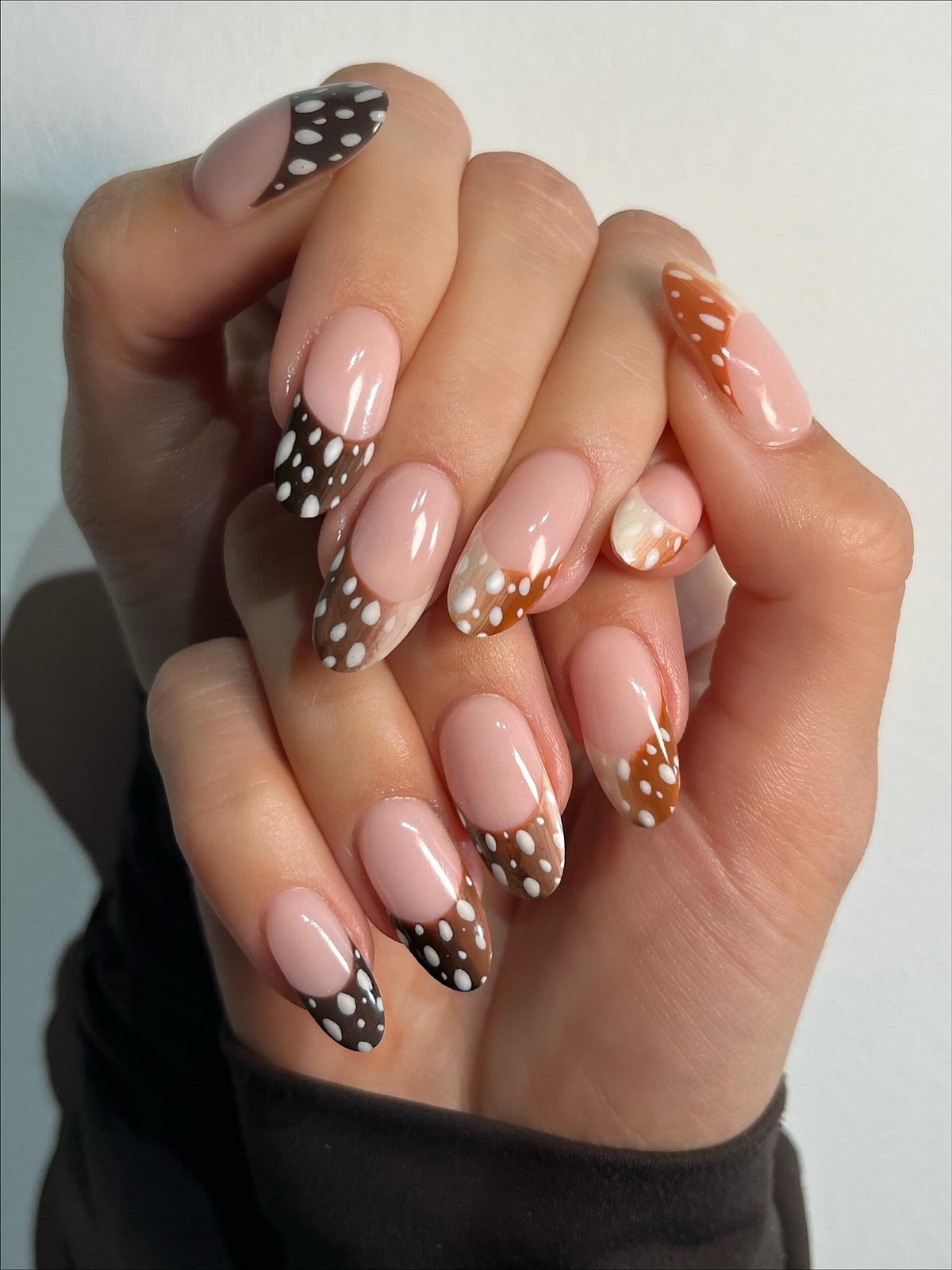 Бэмби-маникюр с мягкими коричневыми оттенками и деликатными пятнышками выглядит особенно уютно. Этот дизайн ассоциируется с теплом, мягкостью и зимним комфортом. Он идеально вписывается в февральскую атмосферу и подходит для коротких ногтей.