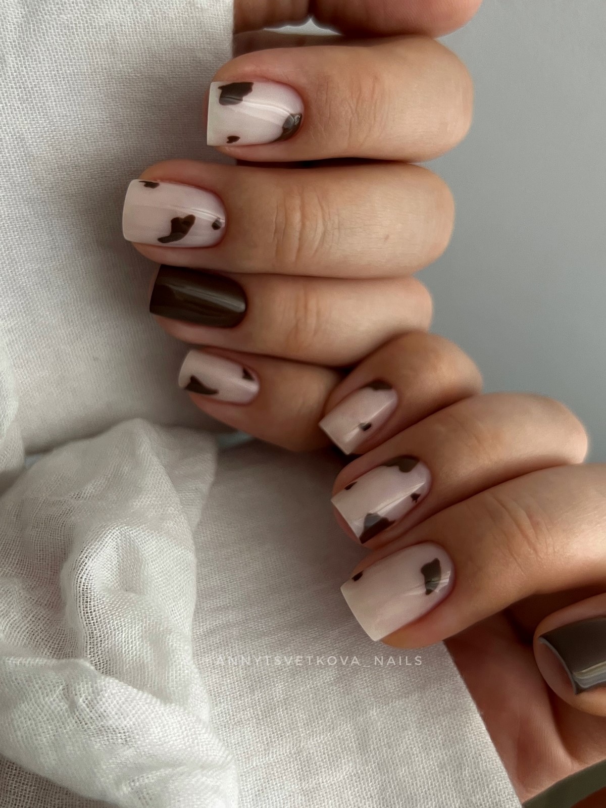 Черепаховый принт на коричневой базе остается одним из самых модных решений сезона. Он смотрится глубоко, интересно и очень стильно, напоминая натуральные текстуры. Такой маникюр отлично дополняет образ в теплых оттенках.