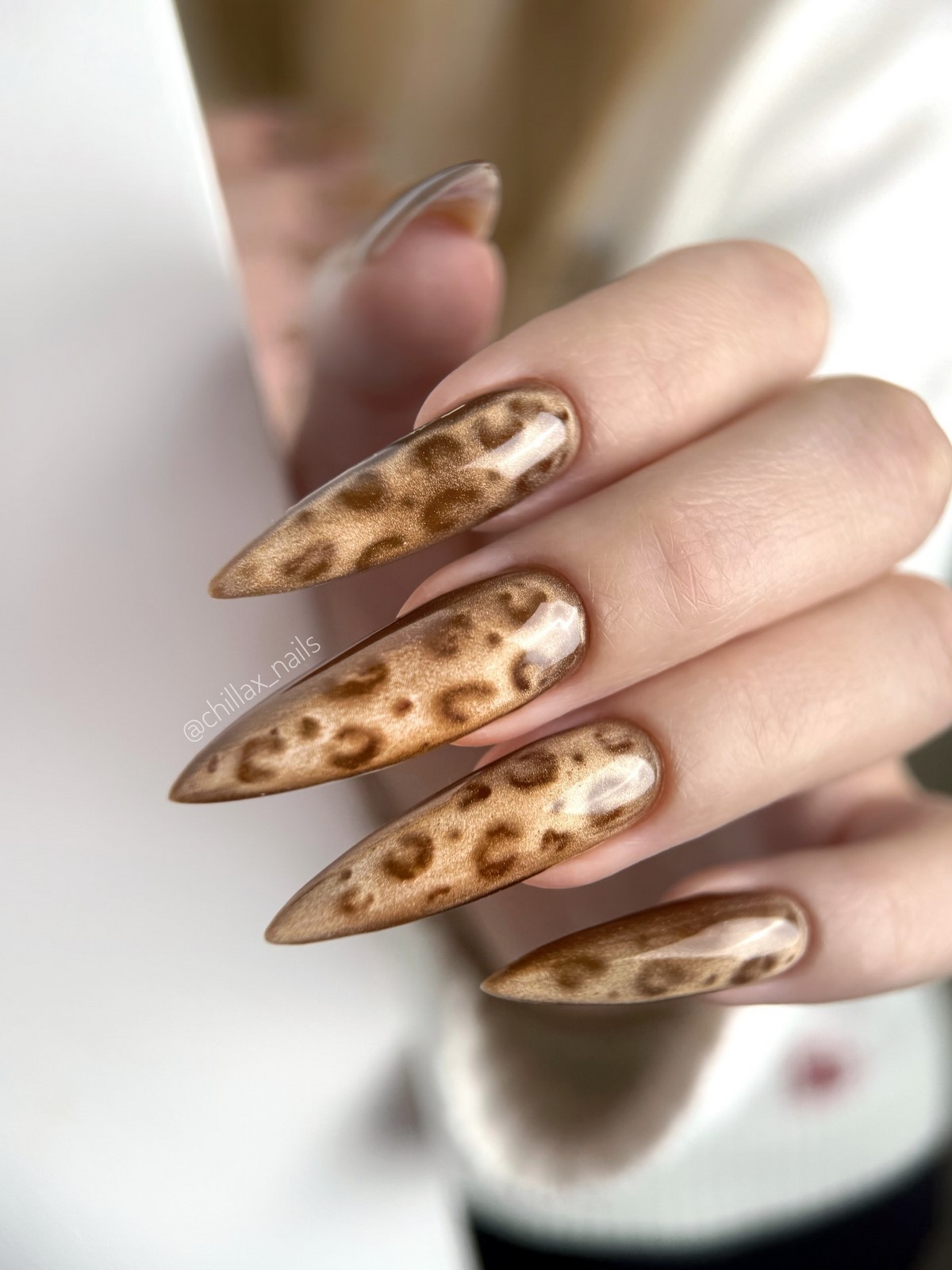 Коричневая база в сочетании с эффектом кошачьего глаза и леопардовым принтом выглядит особенно выразительно. Такой маникюр создает игру света и текстуры, напоминая дорогие аксессуары из натуральной кожи. Леопардовые акценты делают образ смелым, но не вызывающим.
