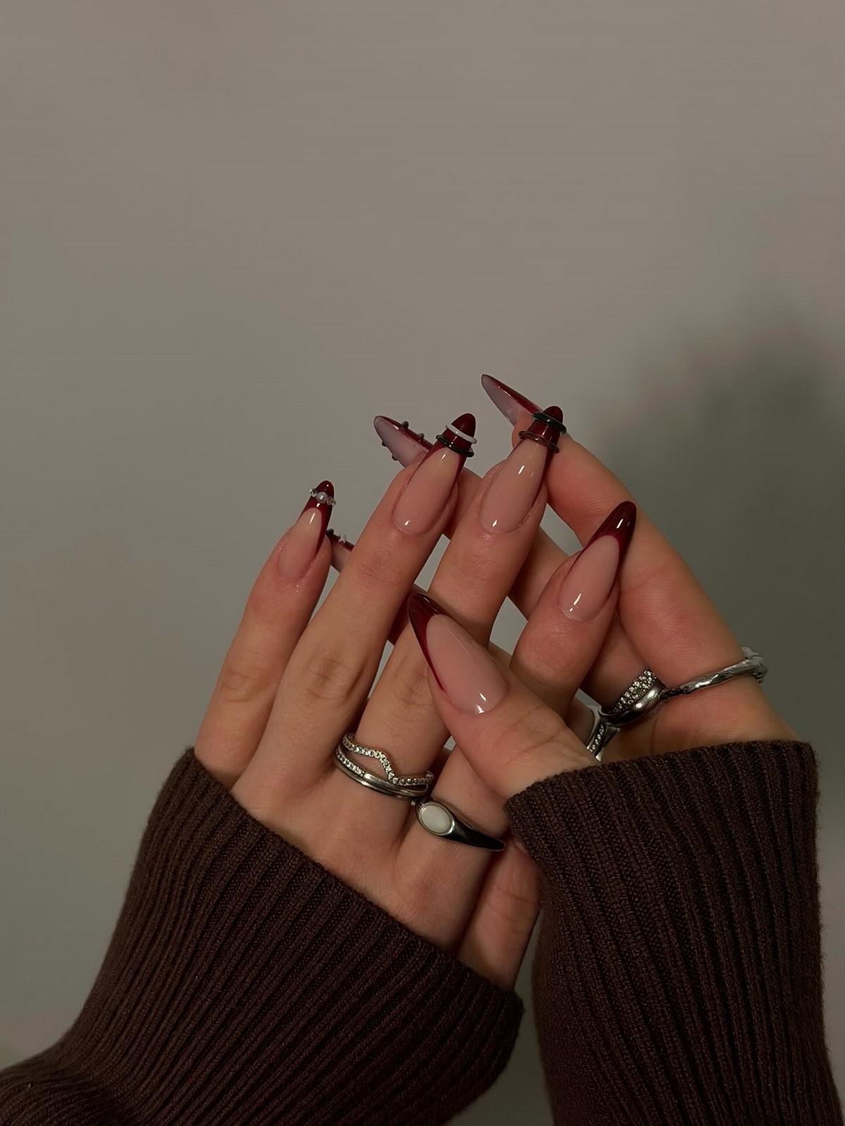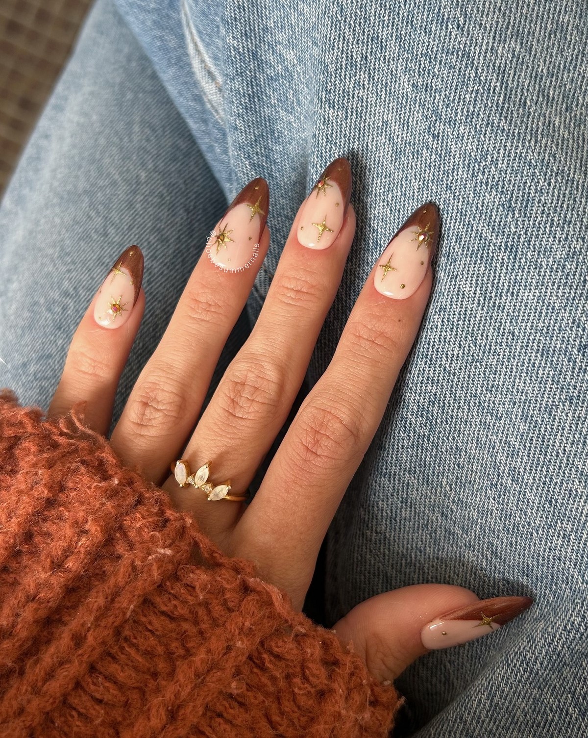 Коричневый френч в феврале 2026 становится праздничным благодаря тонким золотым звездочкам. Они создают ощущение мягкого зимнего сияния и делают маникюр более нарядным. Такой дизайн идеально подходит для вечерних выходов и романтичных встреч.