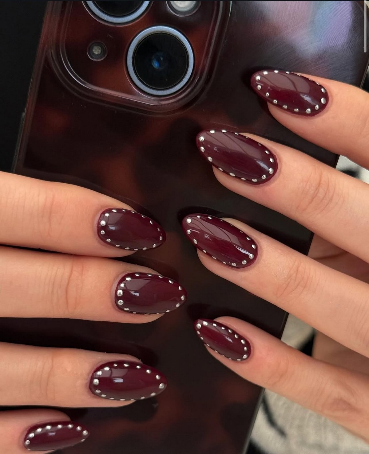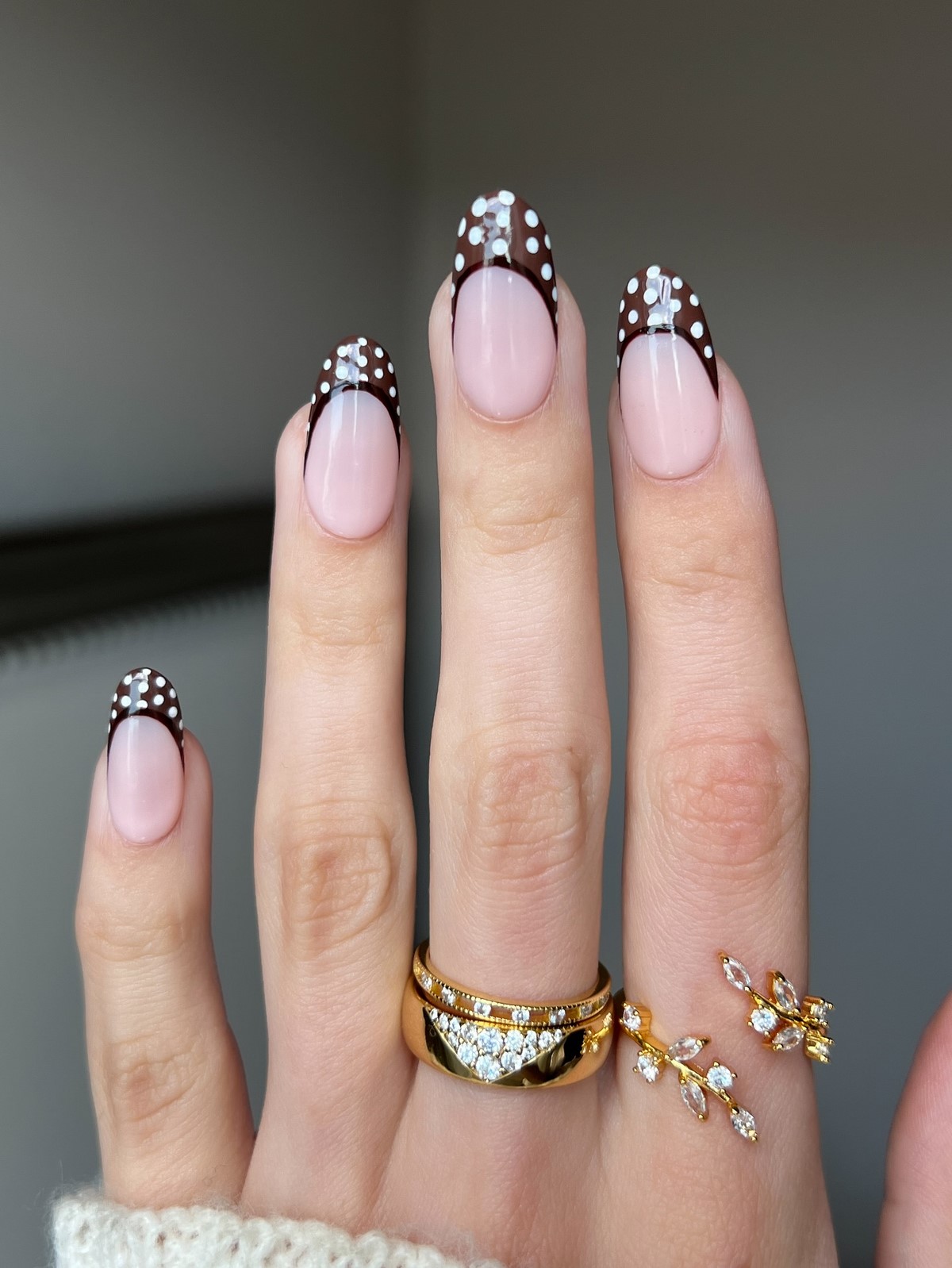 Классический френч в коричневой палитре в феврале 2026 получает новое прочтение благодаря аккуратным точкам Polka Dots. Белые, кремовые или карамельные точки добавляют дизайну легкость и модную графичность. Такой вариант подходит даже для строгого офисного образа.