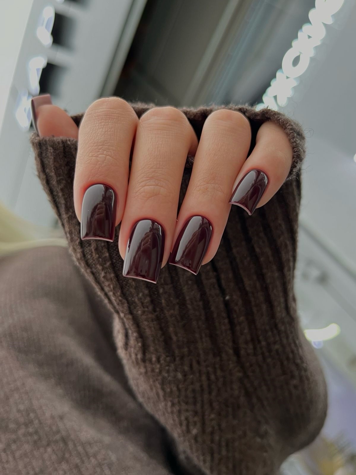Коричневый однотон на квадратной форме ногтей смотрится максимально стильно и уверенно. Особенно актуальны оттенки темного шоколада, какао и холодного мокко. Это тот случай, когда лаконичность становится главным украшением маникюра.