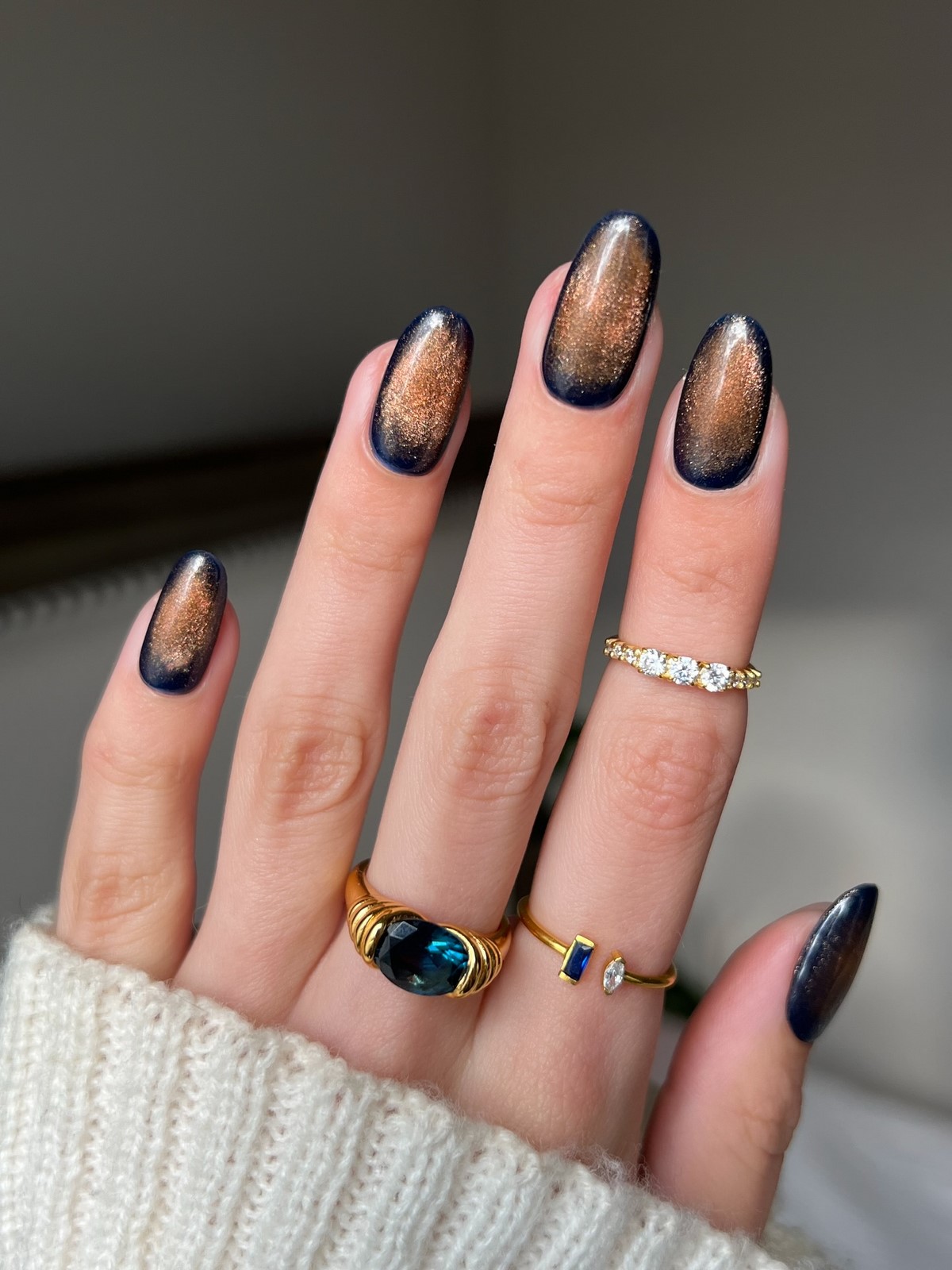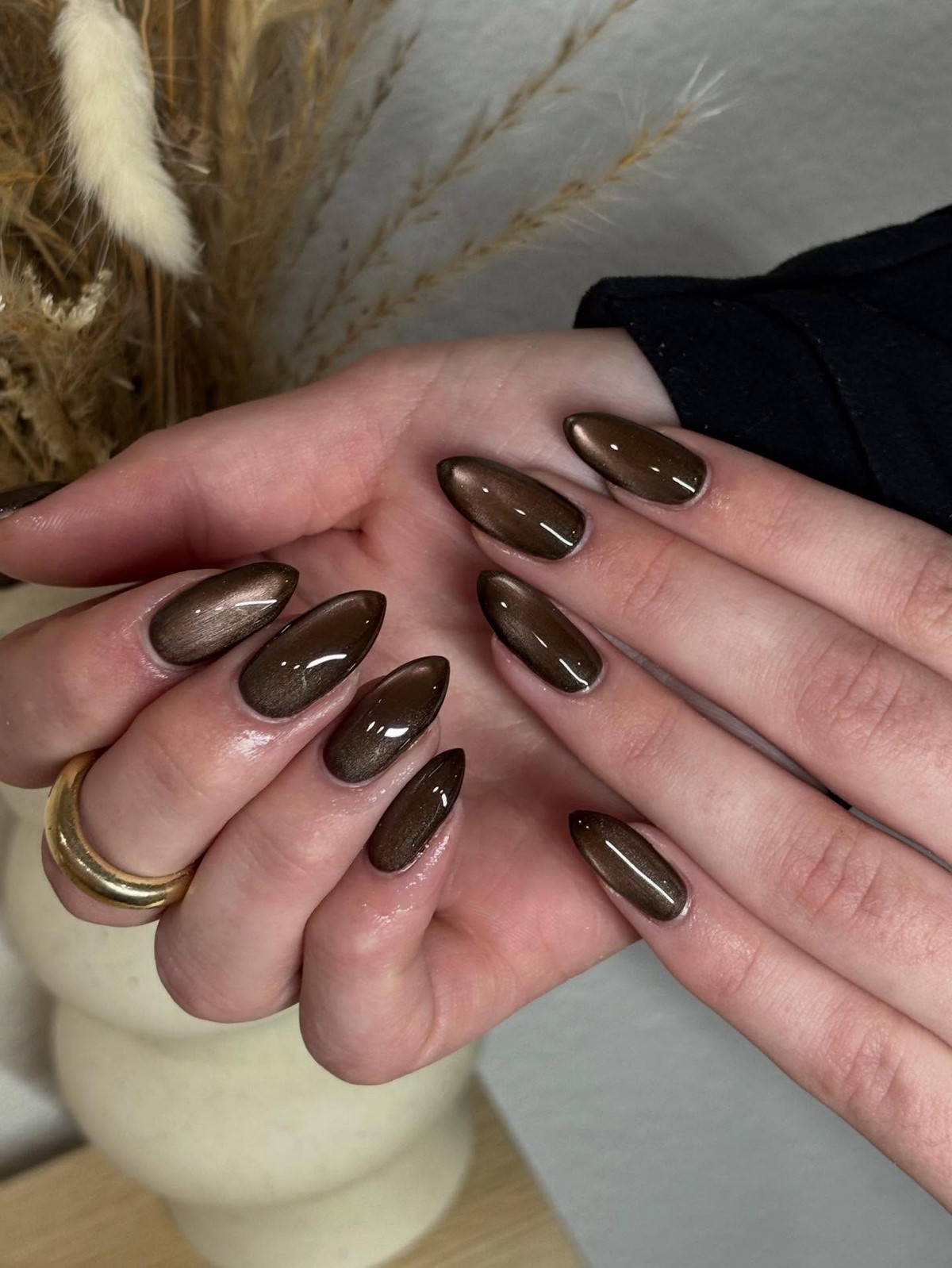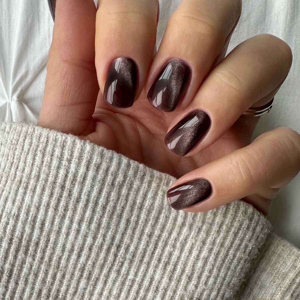 Коричневый кошачий глаз выглядит мягче, чем классические темные версии, но при этом сохраняет эффект глубины. Магнитный блик добавляет ногтям объем и визуальное сияние, которое красиво раскрывается при дневном и вечернем освещении.