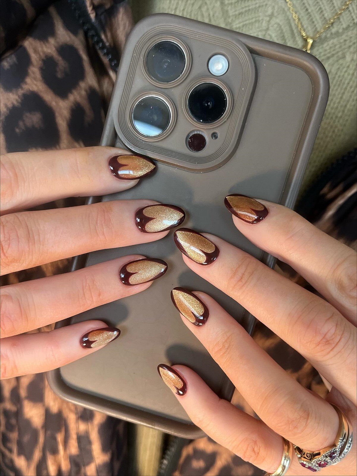 Завершающий аккорд февральских трендов – коричневый маникюр с золотыми сердцами в стиле Cat Eye. Магнитный эффект придает сердцам объем и сияние, делая дизайн особенно эффектным. Это идеальный вариант для романтичного настроения февраля.