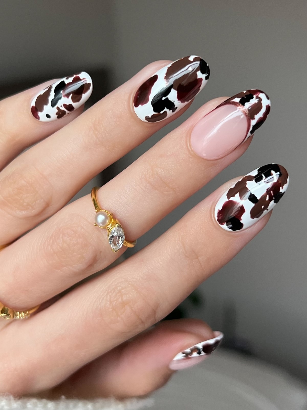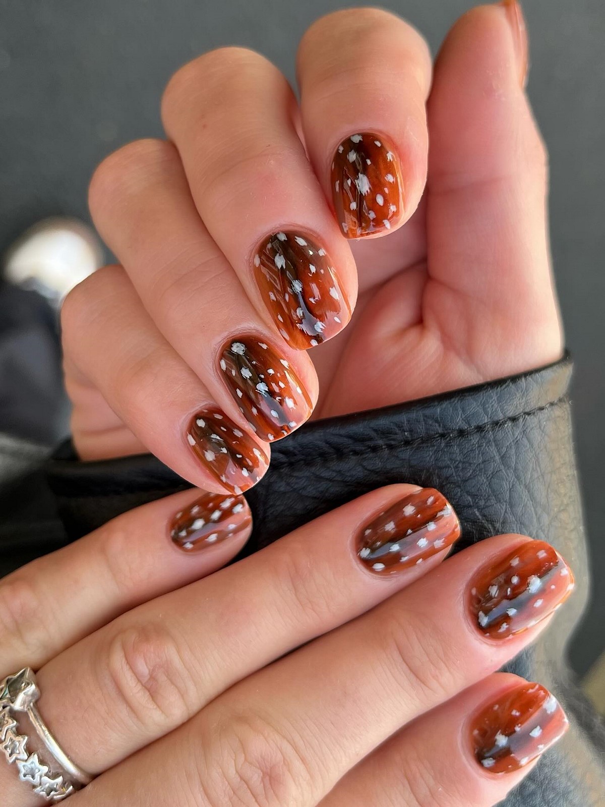 Бэмби-маникюр с мягкими коричневыми оттенками и деликатными пятнышками выглядит особенно уютно. Этот дизайн ассоциируется с теплом, мягкостью и зимним комфортом. Он идеально вписывается в февральскую атмосферу и подходит для коротких ногтей.