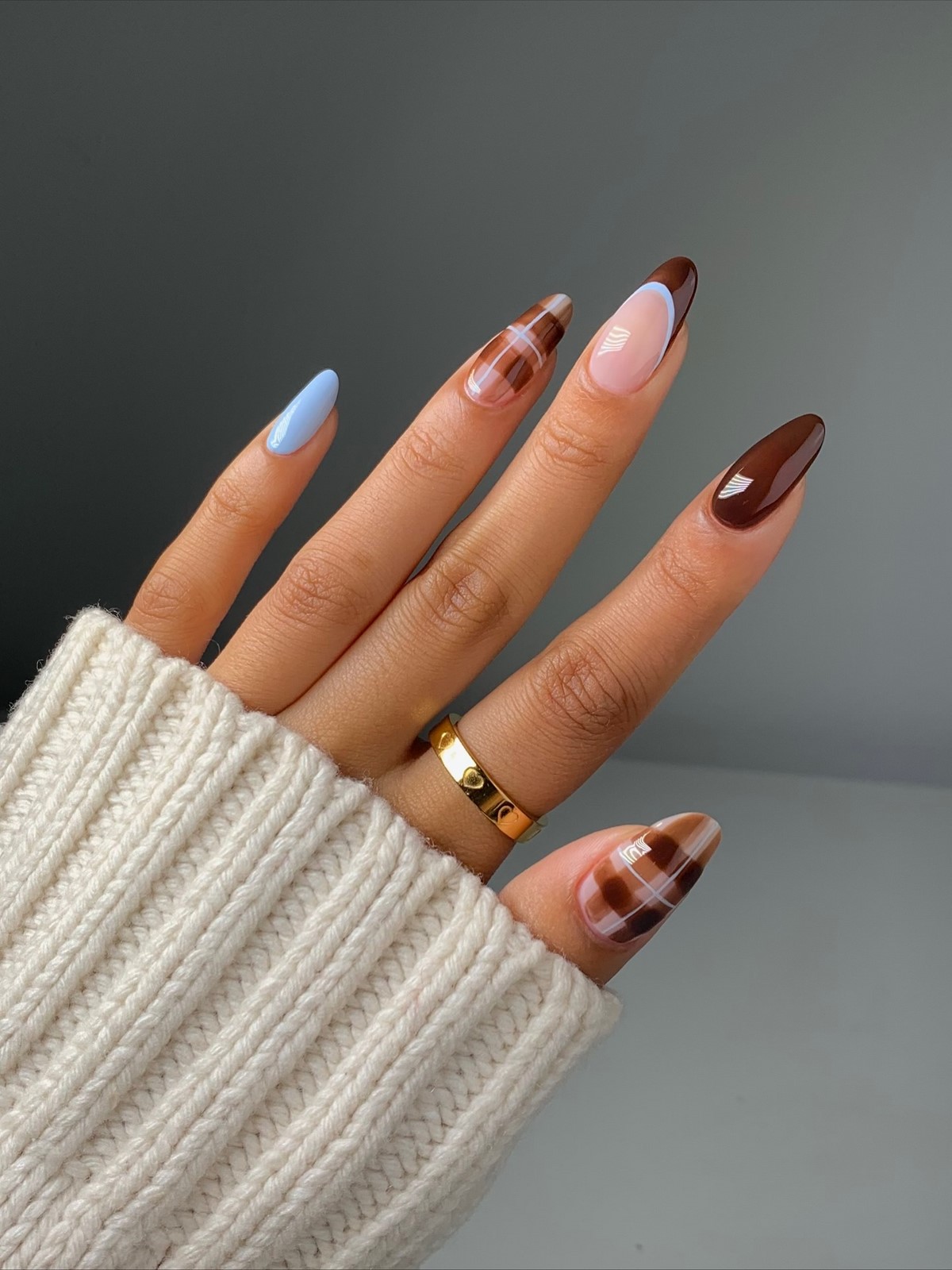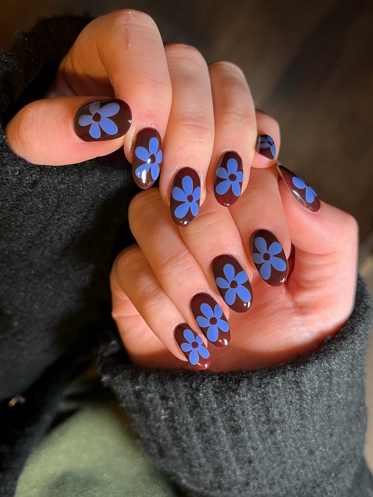 Контраст коричневой базы и нежных голубых цветов выглядит неожиданно свежо. Такой дизайн добавляет маникюру легкости и романтичности, создавая ощущение зимнего неба и первых предвесенних нот. Отличный выбор для тех, кто хочет чего-то необычного.