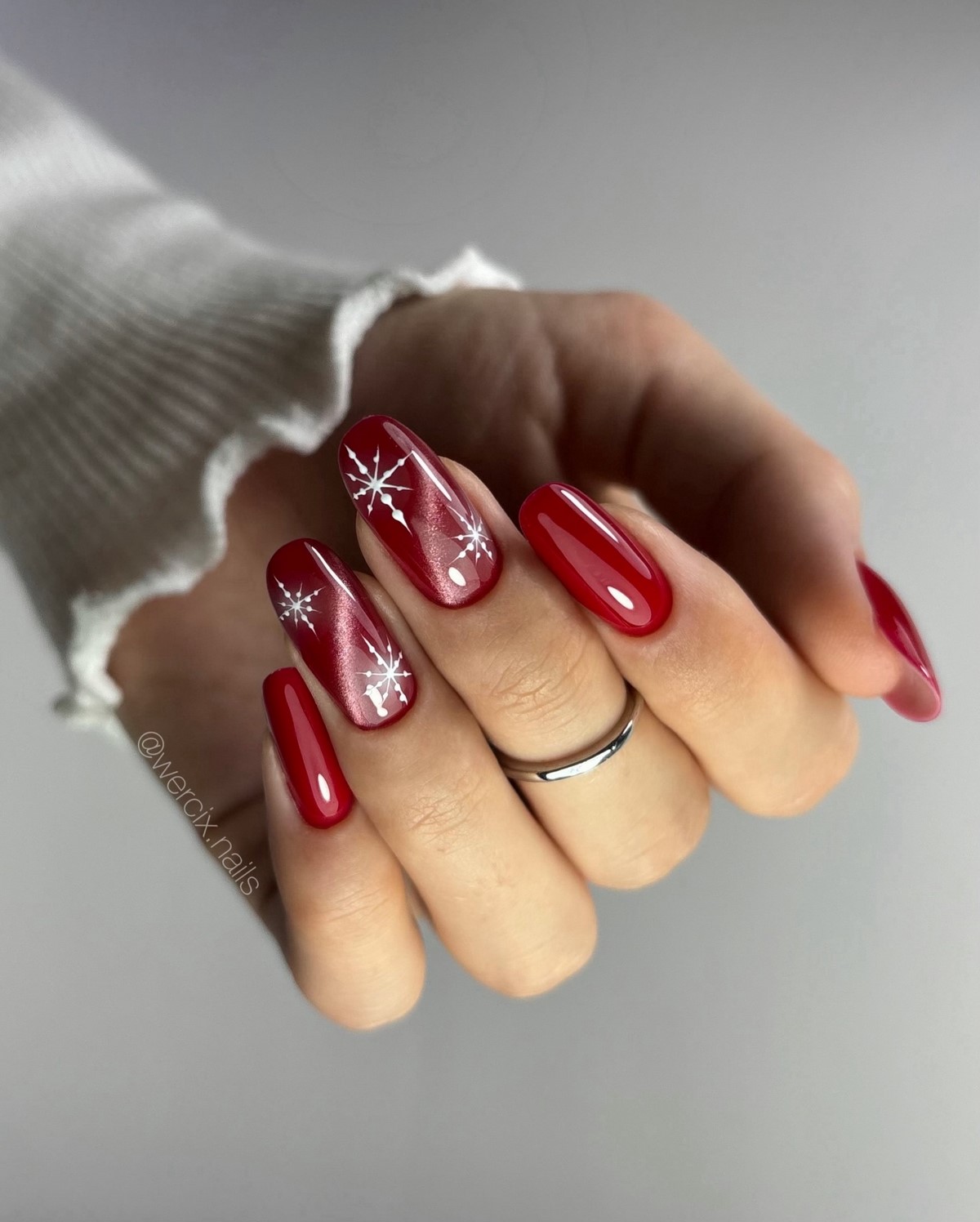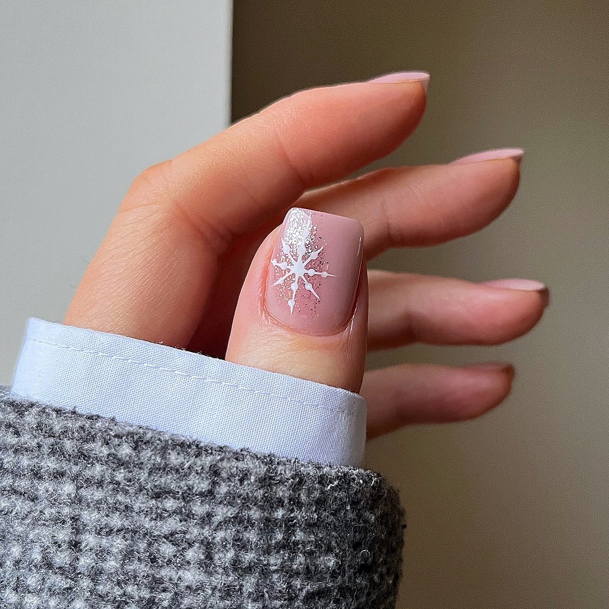 Снежинки в январском маникюре 2026 выглядят более минималистично, чем в декабре. Это тонкие линии, микродекор или один-два акцентных ногтя с зимним рисунком.