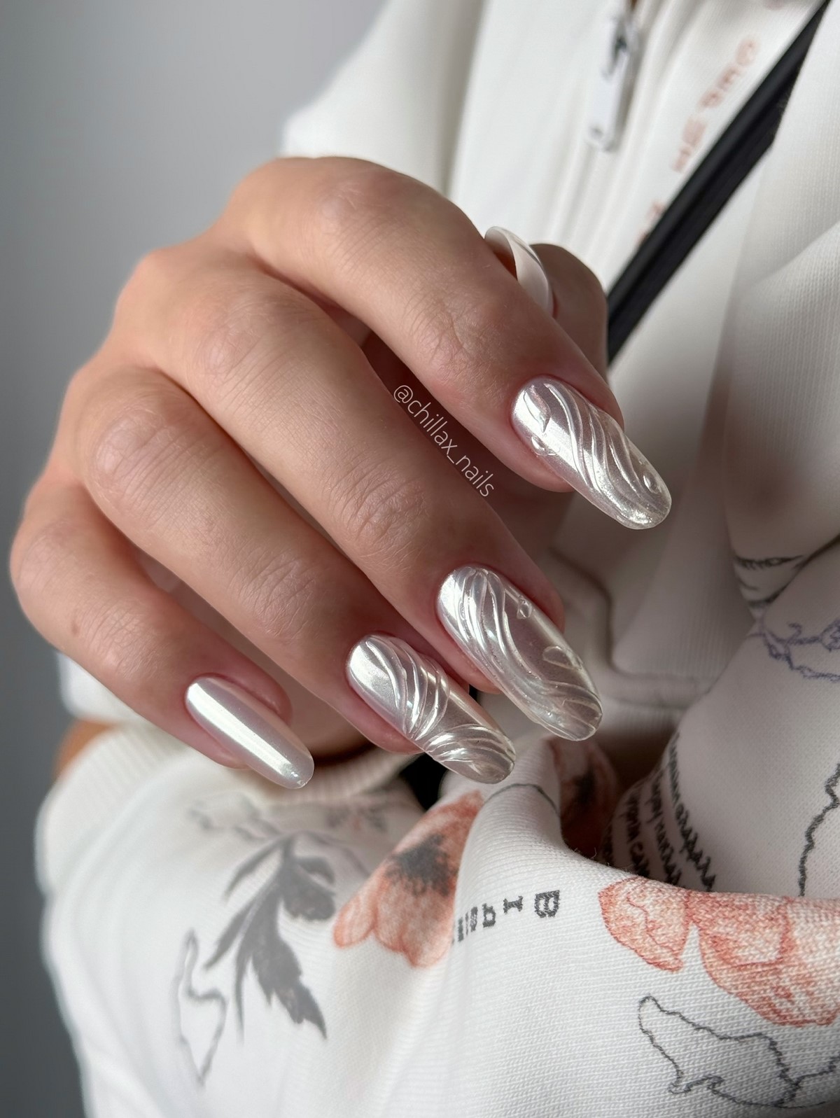Перламутровые ногти — абсолютный фаворит января 2026. Такой маникюр ассоциируется с инеем, снегом и зимним сиянием, подчеркивая ухоженность рук.