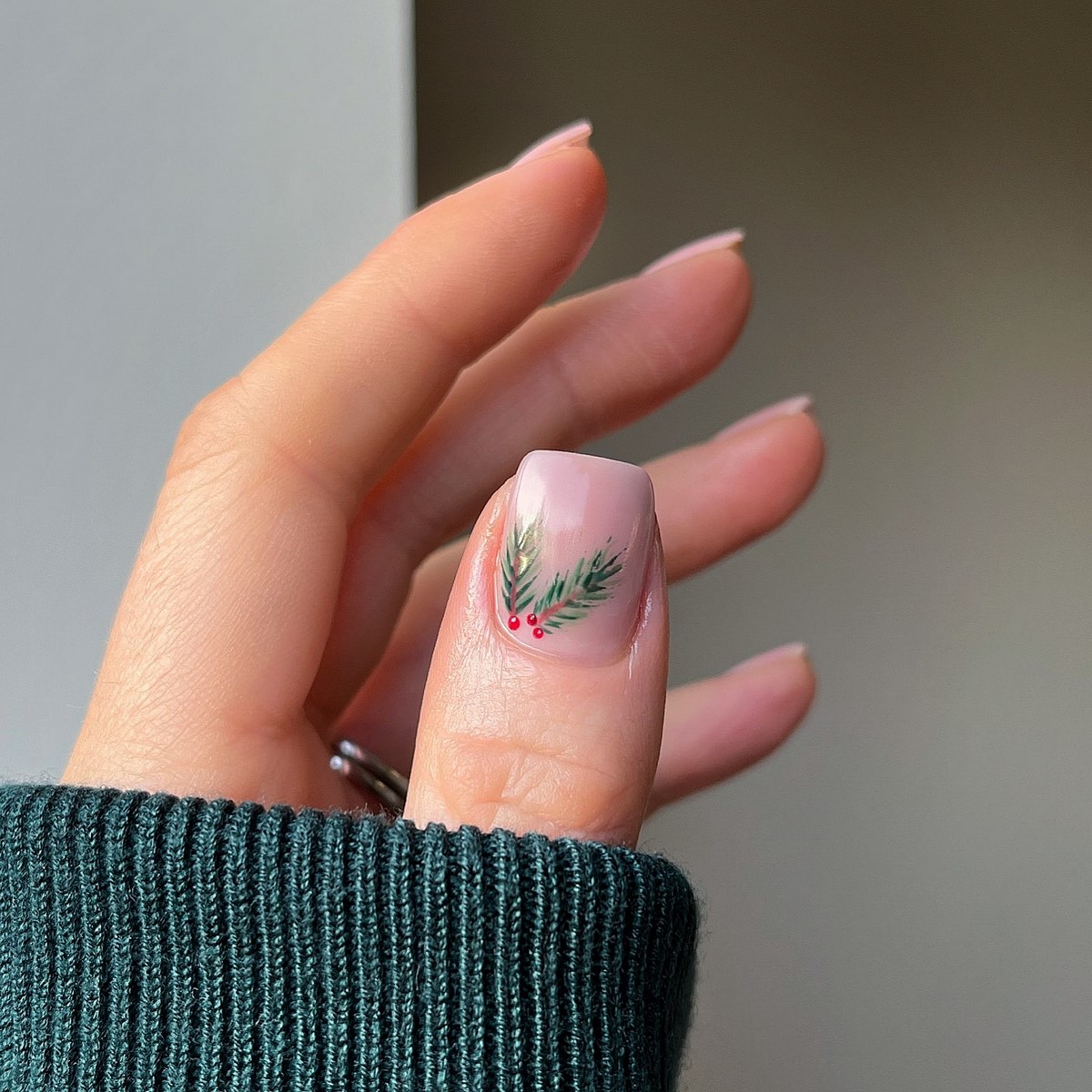 Маникюр с еловыми веточками в январе 2026 становится более стилизованным и утонченным. В моде не реалистичные рисунки, а графичные, минималистичные элементы.