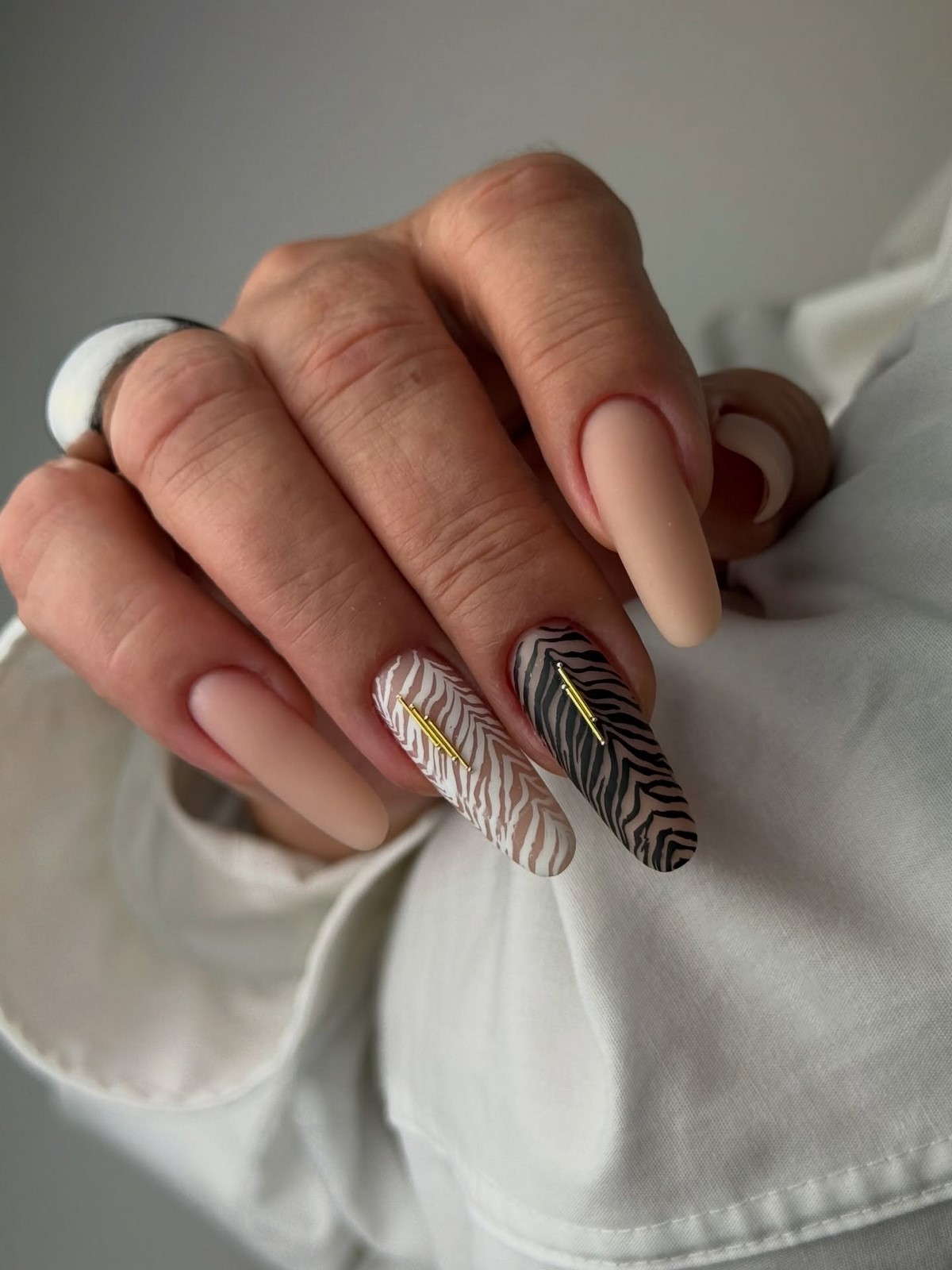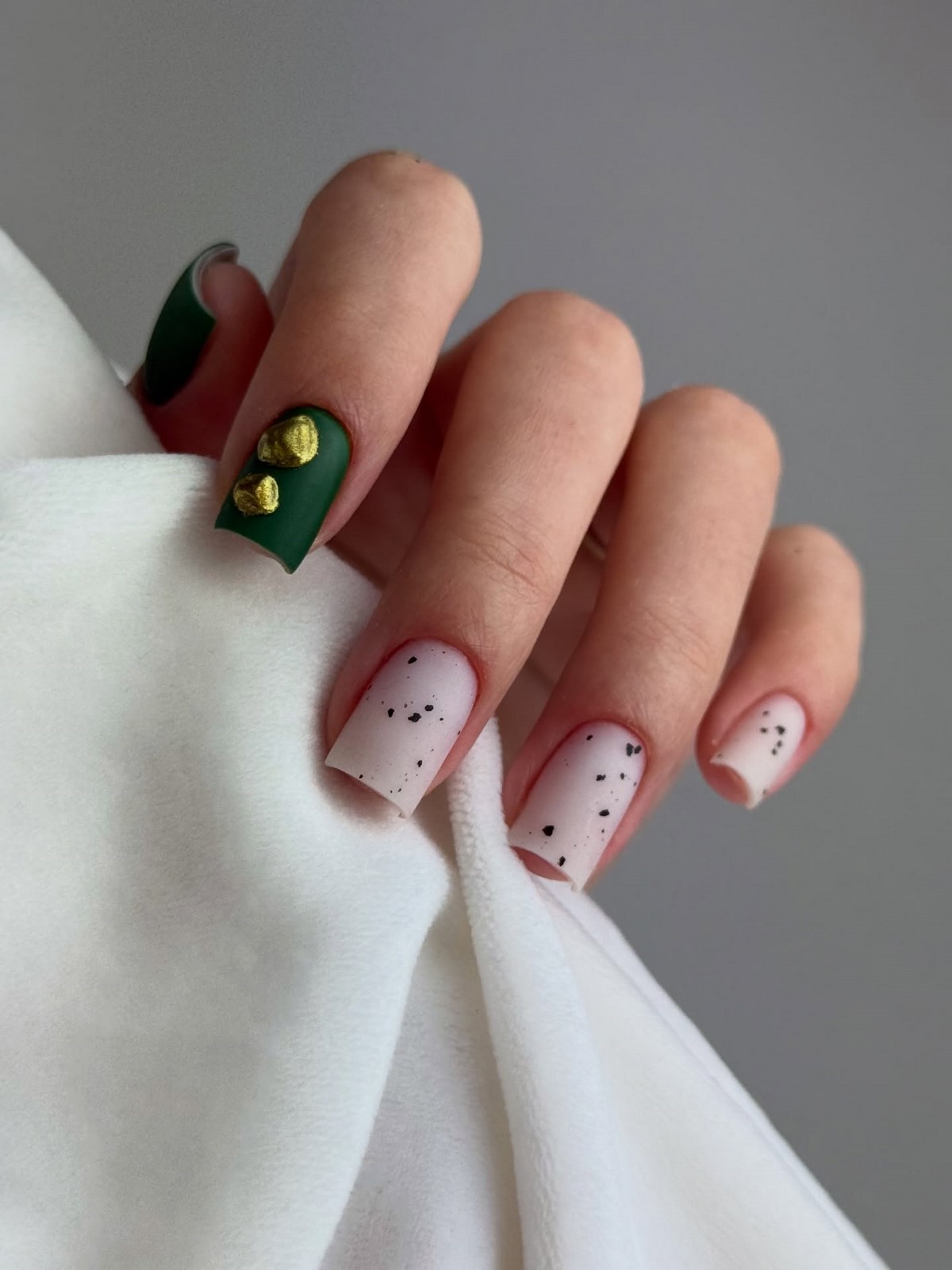 Тонкие линии зеленого, хаки или темно-изумрудного цвета красиво смотрятся на молочной или бежевой основе. Часто дизайн дополняют микроблестками или тонким золотым контуром.