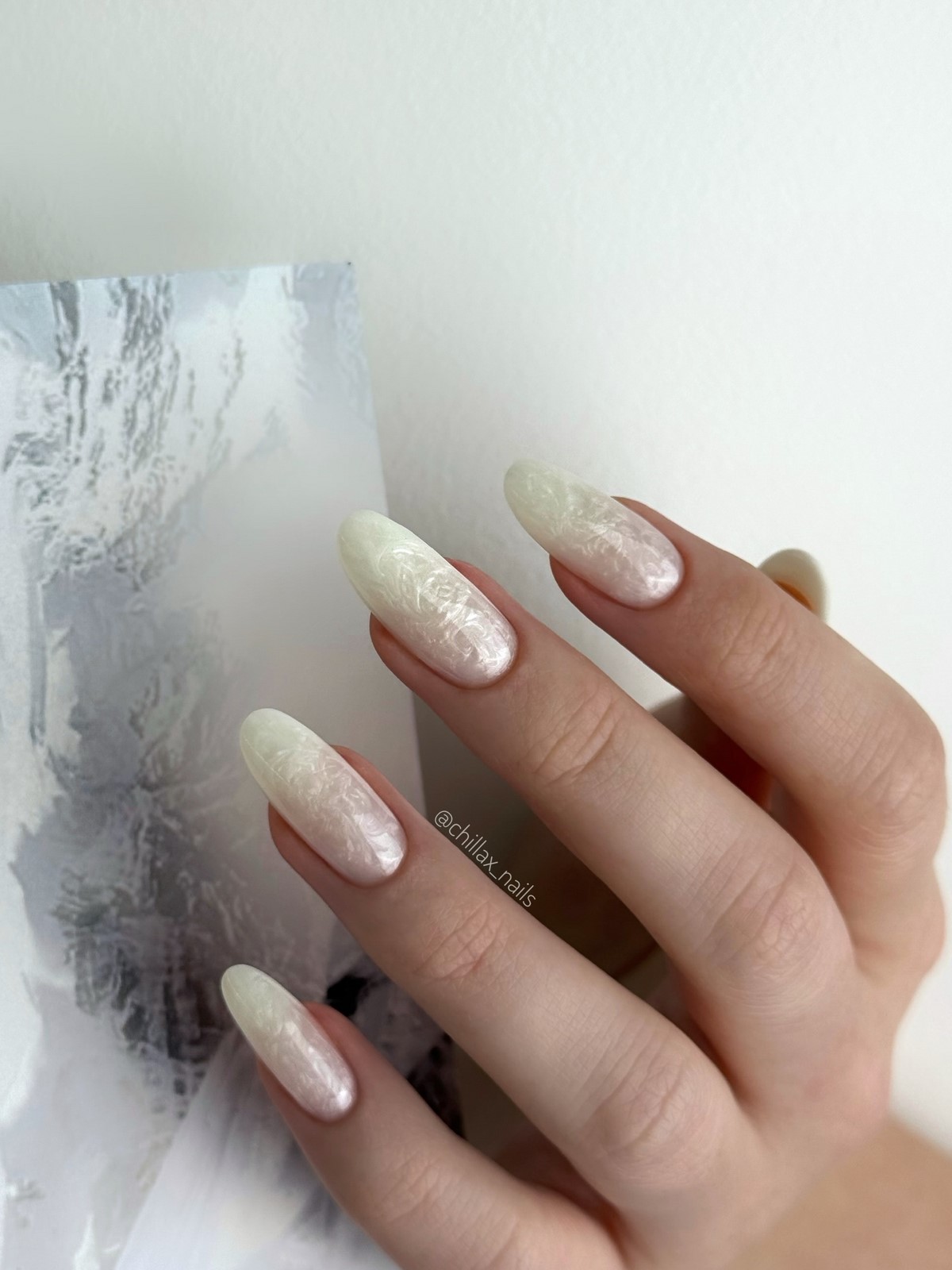 Особенно актуальны молочно-белые, жемчужные, розово-опаловые и ледяные голубые оттенки. Перламутр может быть как легким, полупрозрачным, так и более насыщенным — в зависимости от желаемого эффекта.