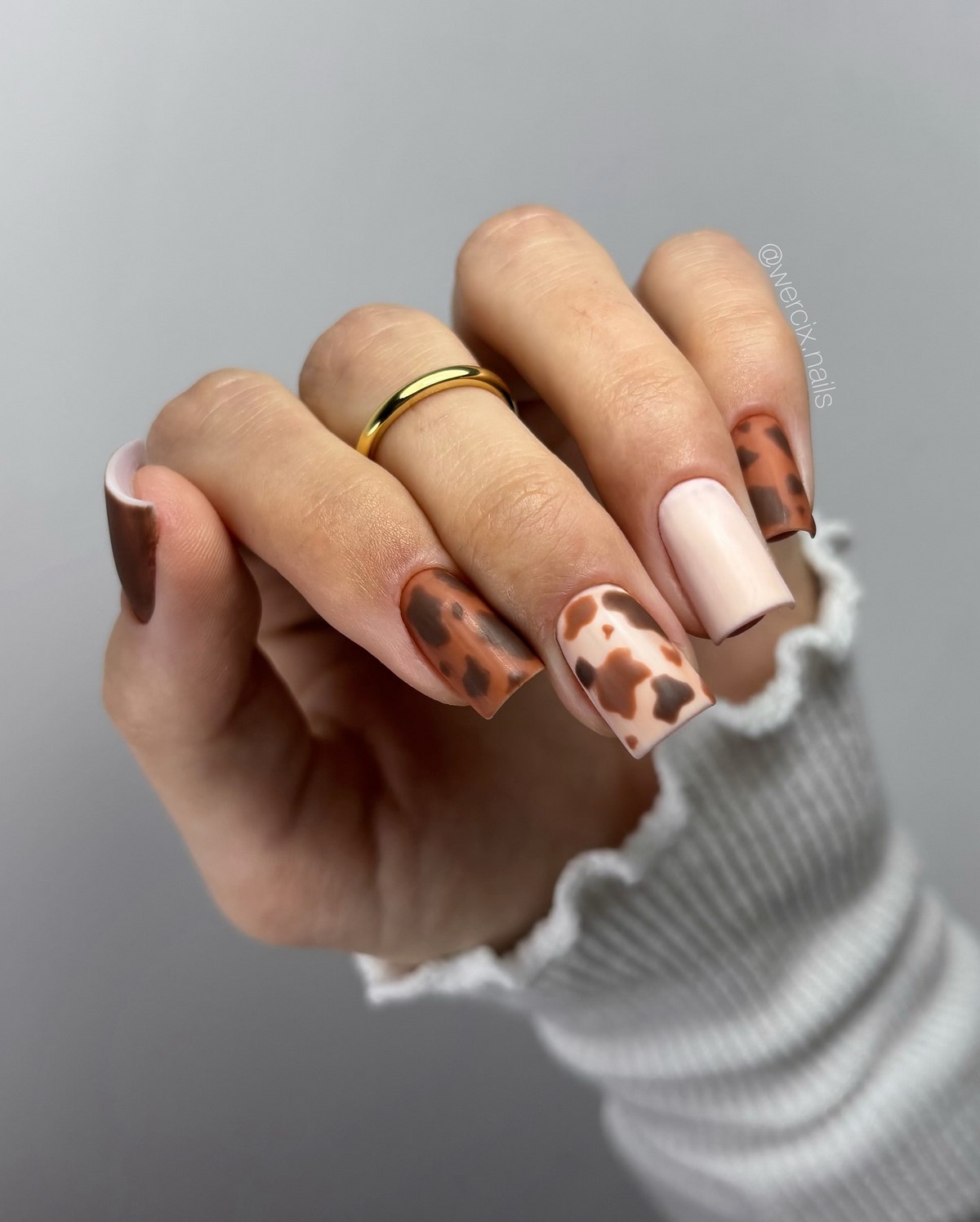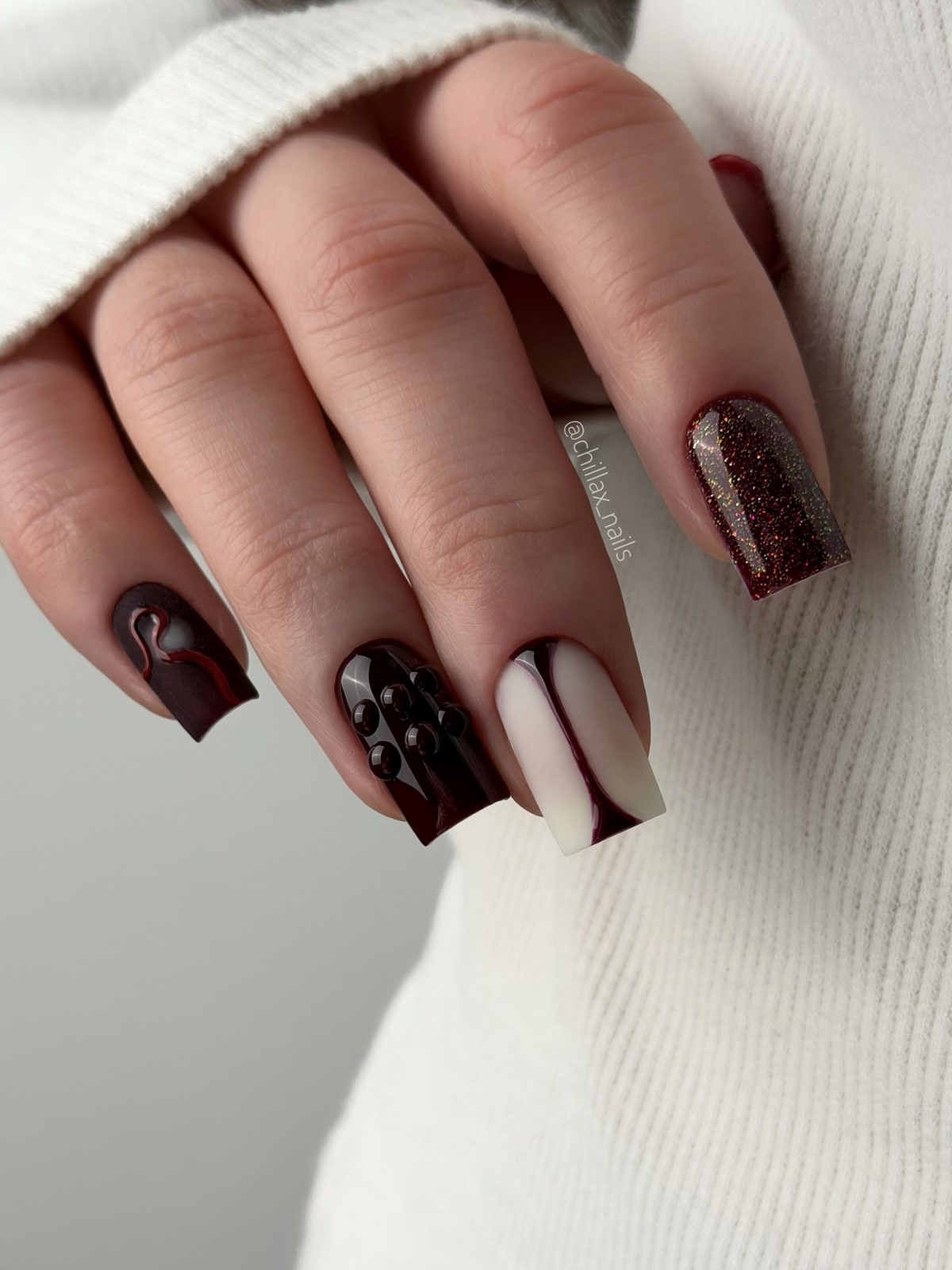 Чаще всего Polka Dots выполняют на молочной, бежевой или полупрозрачной базе, сочетая белые, черные или серебристые точки. Такой дизайн идеально подходит для коротких ногтей и повседневных зимних образов.