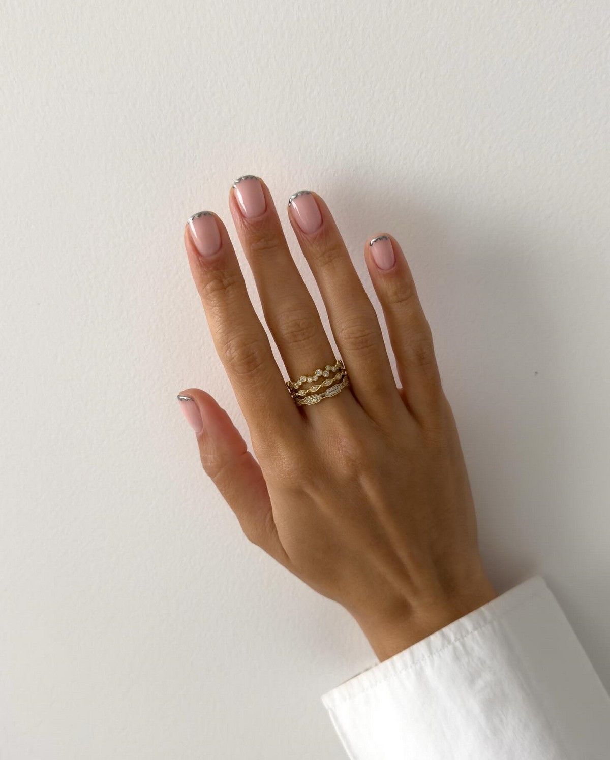 Микрофренч становится эволюцией классического французского маникюра. Тонкая линия улыбки выглядит аккуратно, современно и не отвлекает внимание от общей эстетики рук.
