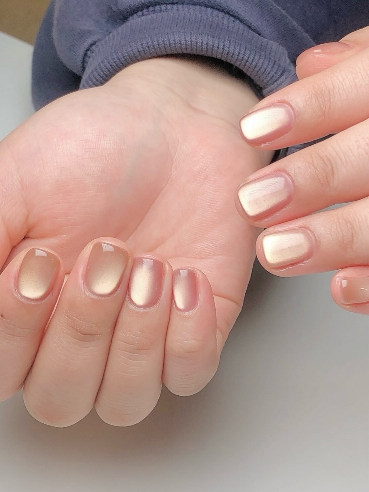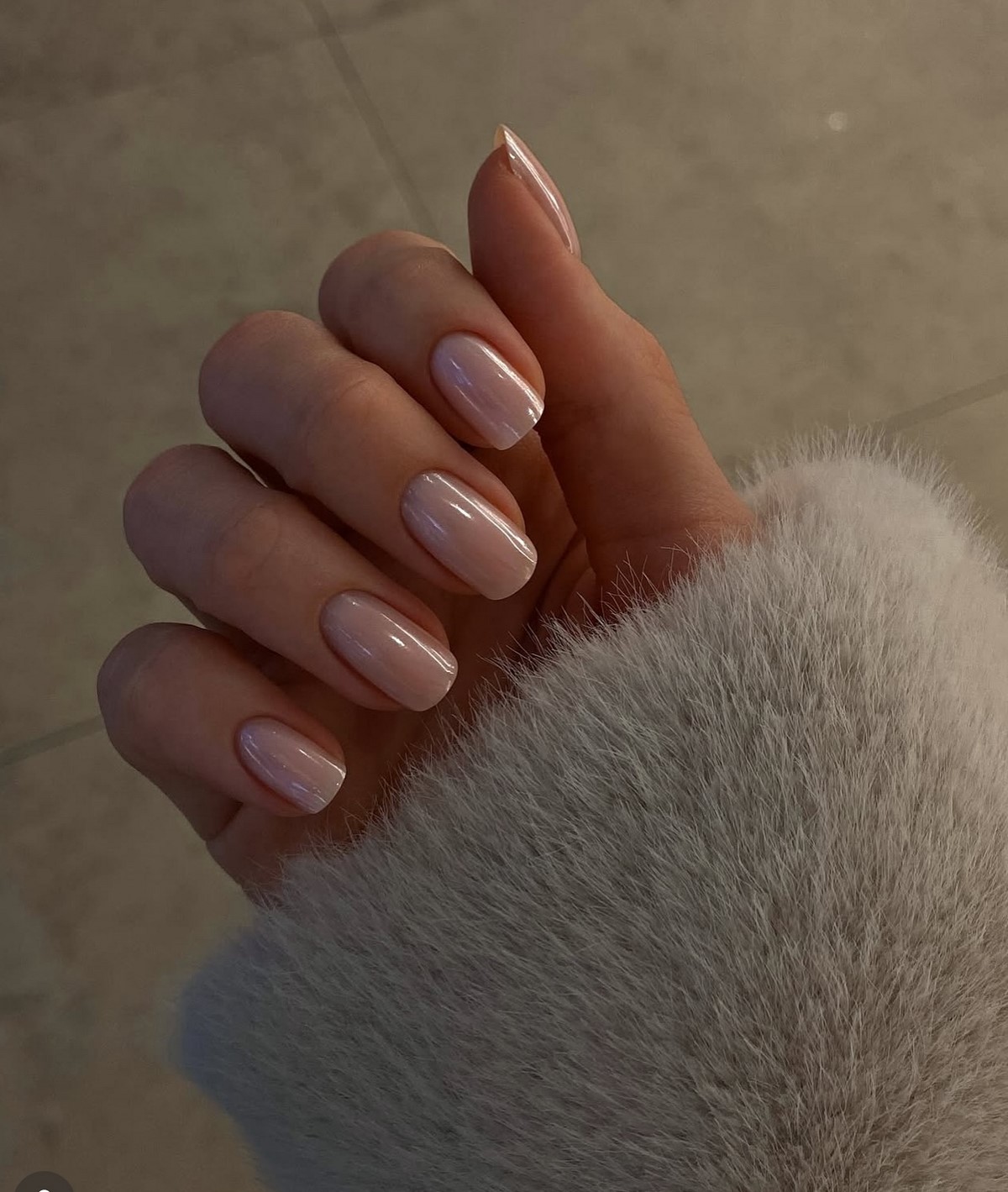 Глазированный эффект с мягким жемчужным сиянием продолжает оставаться в списке самых востребованных решений. Он добавляет ногтям глубину и свет, не превращая маникюр в акцентный.