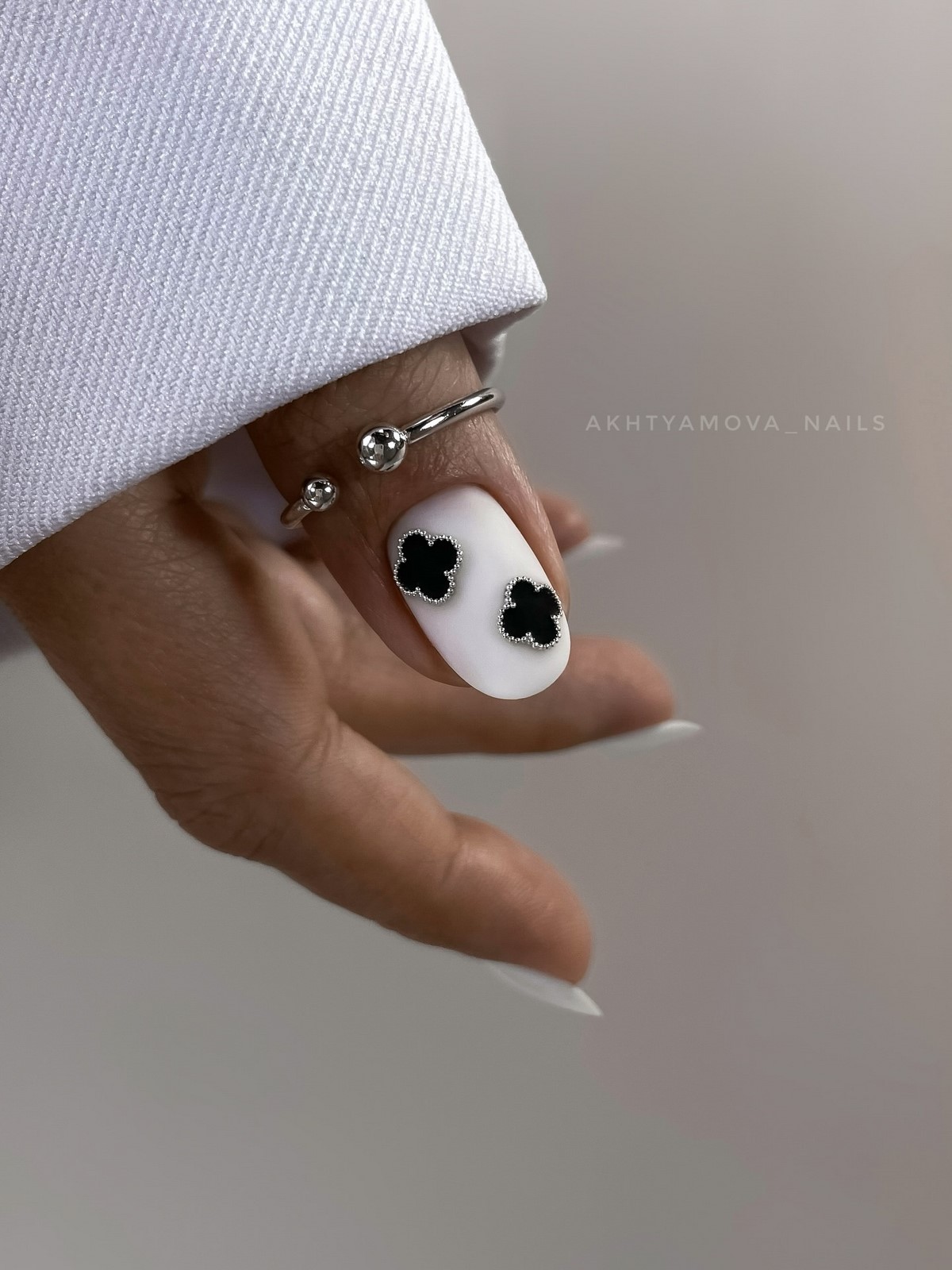 Молочная база остается фаворитом зимы 2026, особенно в сочетании с минималистичным декором, вдохновленным ювелирными мотивами Van Cleef. Тонкие клеверные элементы, микро-инкрустации или изящные золотые линии создают ассоциации с украшениями haute joaillerie. Такой маникюр выглядит утонченно и подчеркивает безупречный вкус.