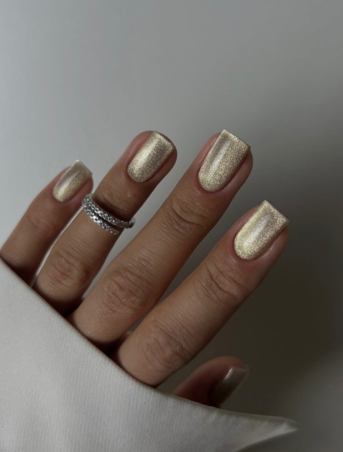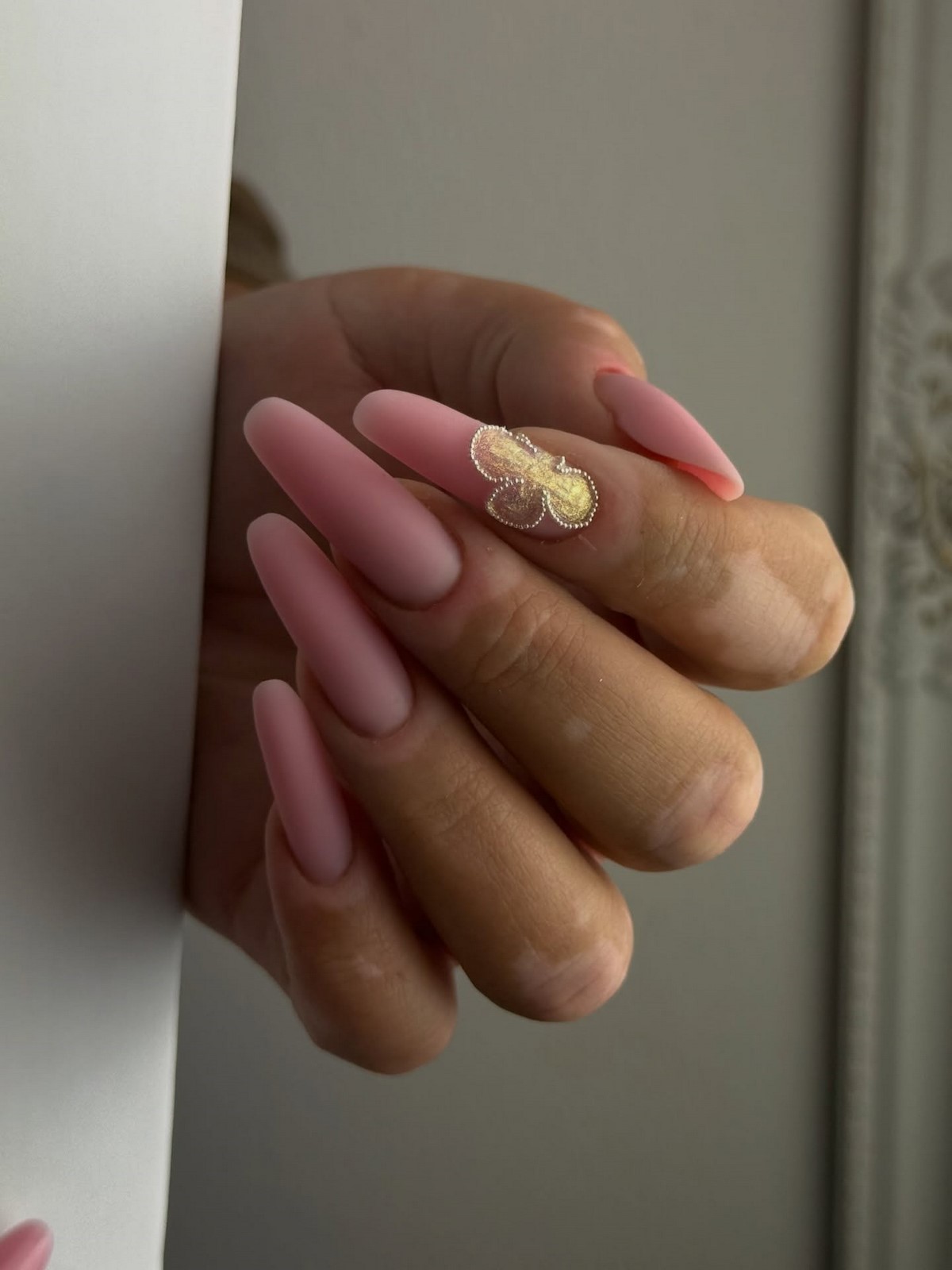 Матовые нюдовые оттенки в сочетании с золотыми деталями — один из самых «дорогих» вариантов маникюра на зиму 2026. Тонкие золотые полосы, микро-фольга или абстрактные линии добавляют благородства и визуальной глубины. Этот дизайн идеально подойдет для тех, кто ценит минимализм с характером.