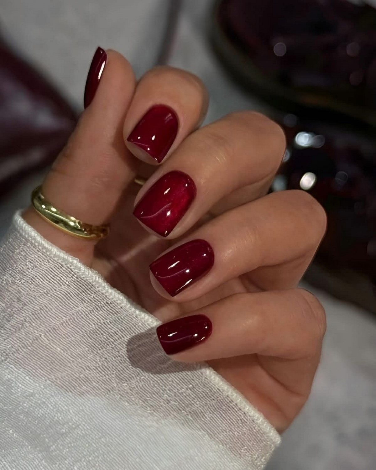 Гранатовый оттенок на коротких ногтях — воплощение зимней элегантности. Глубокий, насыщенный цвет подчеркивает форму ногтей и выглядит особенно статусно без дополнительного декора. Это идеальный вариант для тех, кто ценит классику с характером.