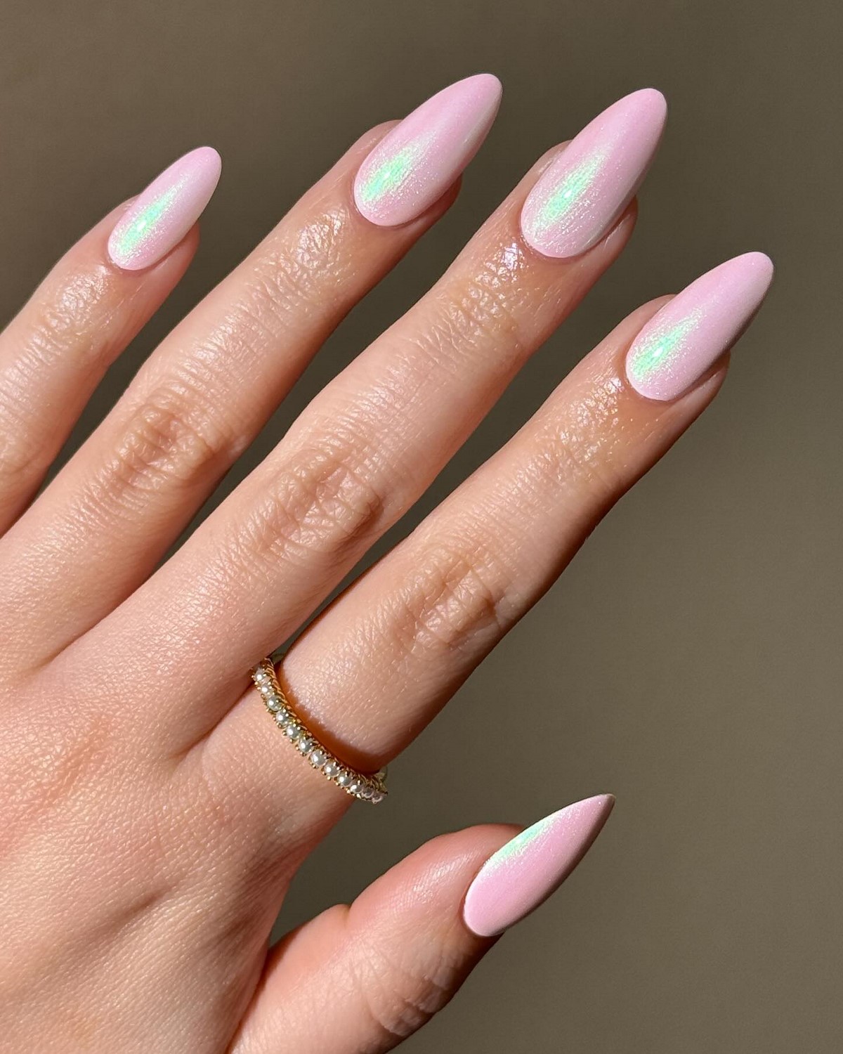 Стеклянный эффект остается в тренде, но становится более утонченным. Полупрозрачные покрытия с эффектом «жидкого стекла» выглядят дорого за счет идеальной поверхности и чистоты цвета. Особенно актуальны холодные оттенки — прозрачный розовый, айс-нюд, ледяной беж.