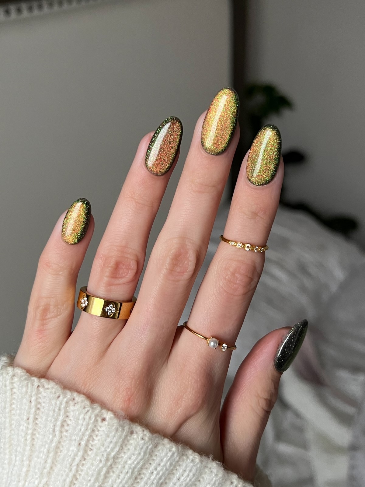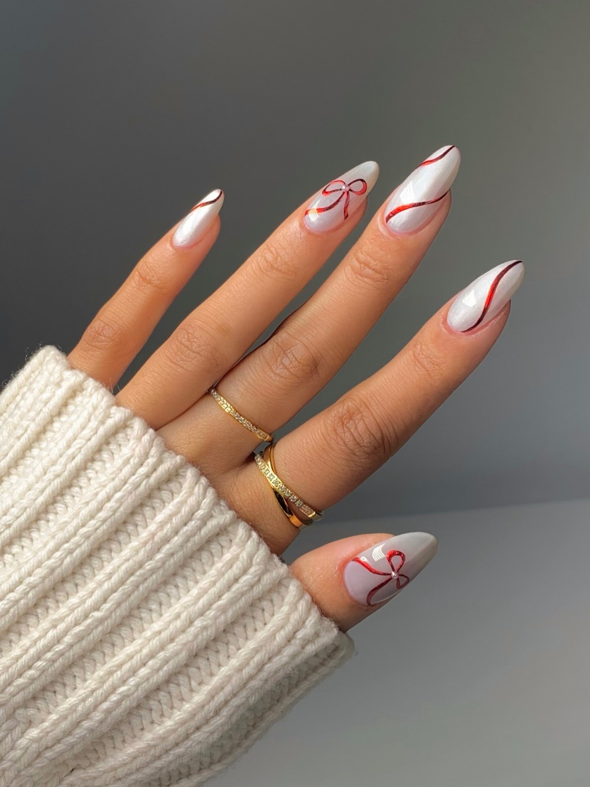 Красный глиттер в зимнем сезоне используется дозировано — только как акцент. Один сияющий ноготь на фоне глубокого винного или бордового покрытия создает ощущение продуманной роскоши. Такой прием выглядит празднично, но не перегружено, особенно в вечерних зимних образах.
