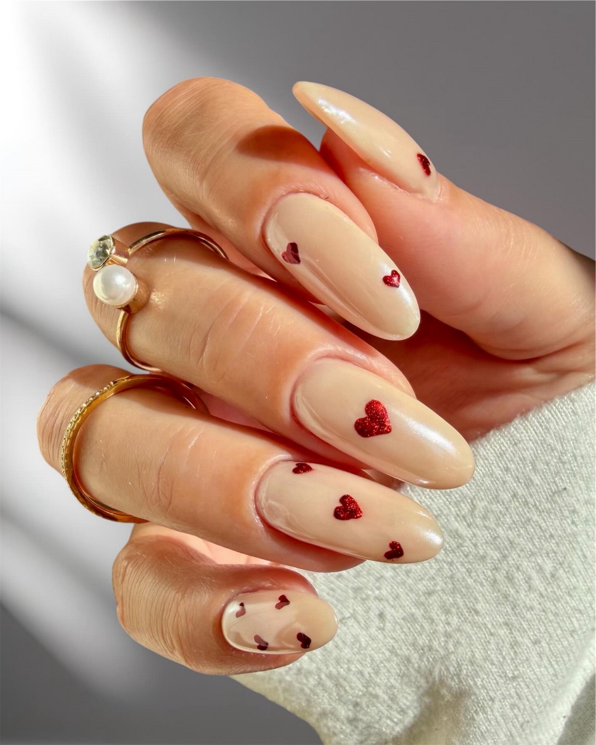 Бежевые оттенки остаются универсальной базой для нейл дизайна, и февраль 2026 не становится исключением. Сердечки на бежевом фоне выглядят особенно утонченно, если выполнены в тонкой графике или полупрозрачной текстуре.