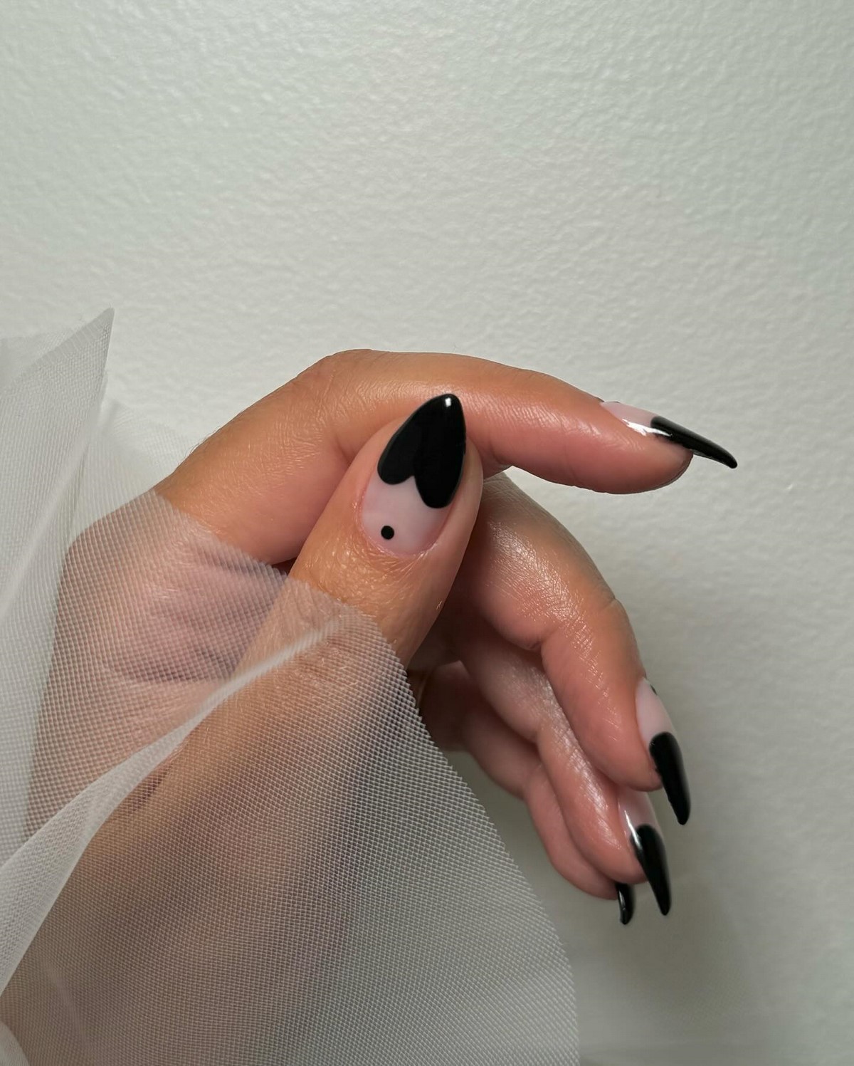 Черный маникюр в сочетании с Negative Space выглядит особенно эффектно в феврале 2026. Прозрачные участки создают ощущение легкости, а сердечки в таком дизайне смотрятся графично и утонченно. Чаще всего используются миниатюрные сердца, выполненные тонкой линией или в виде едва заметного контура.