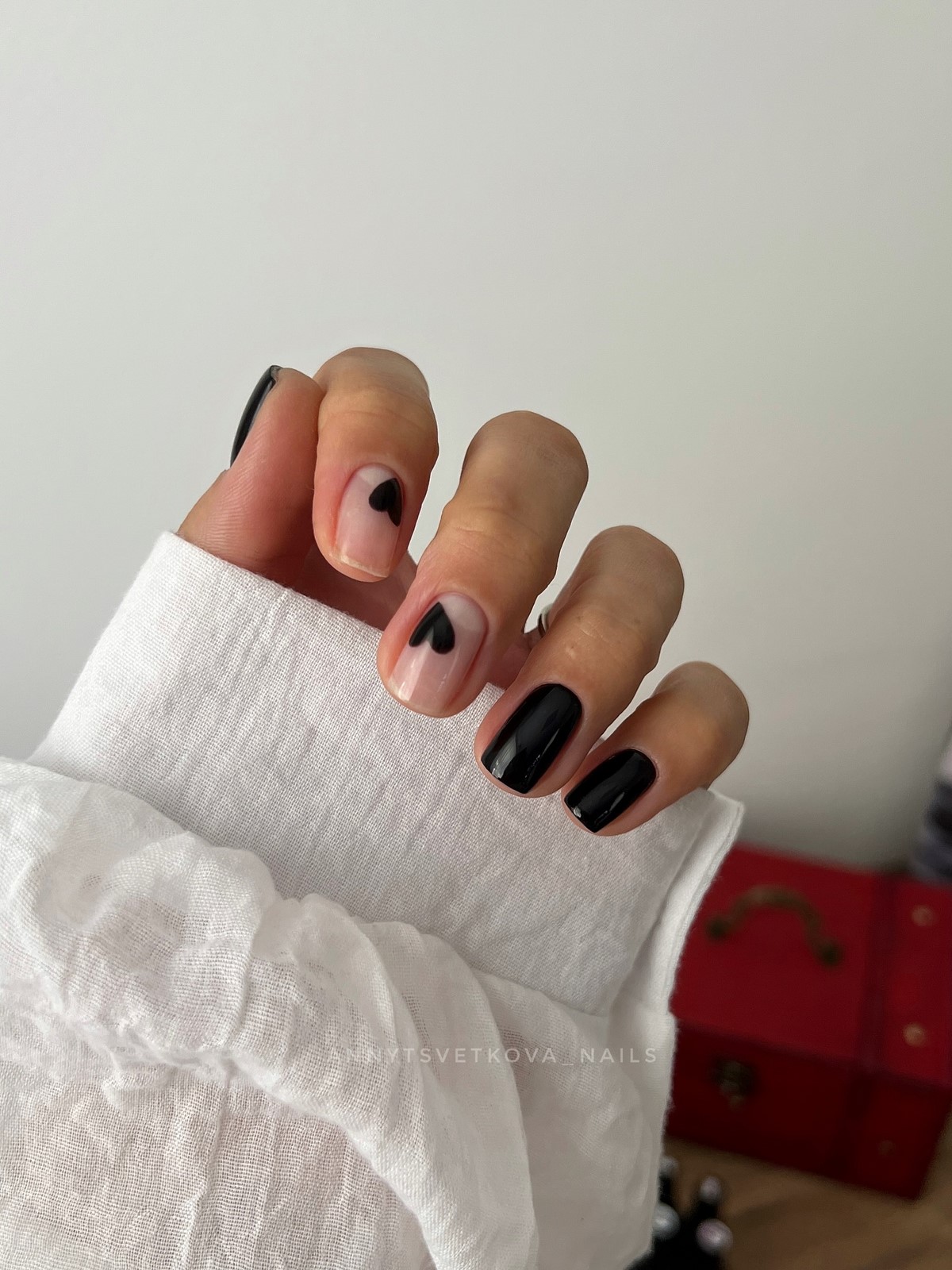 Черный маникюр в сочетании с Negative Space выглядит особенно эффектно в феврале 2026. Прозрачные участки создают ощущение легкости, а сердечки в таком дизайне смотрятся графично и утонченно. Чаще всего используются миниатюрные сердца, выполненные тонкой линией или в виде едва заметного контура.