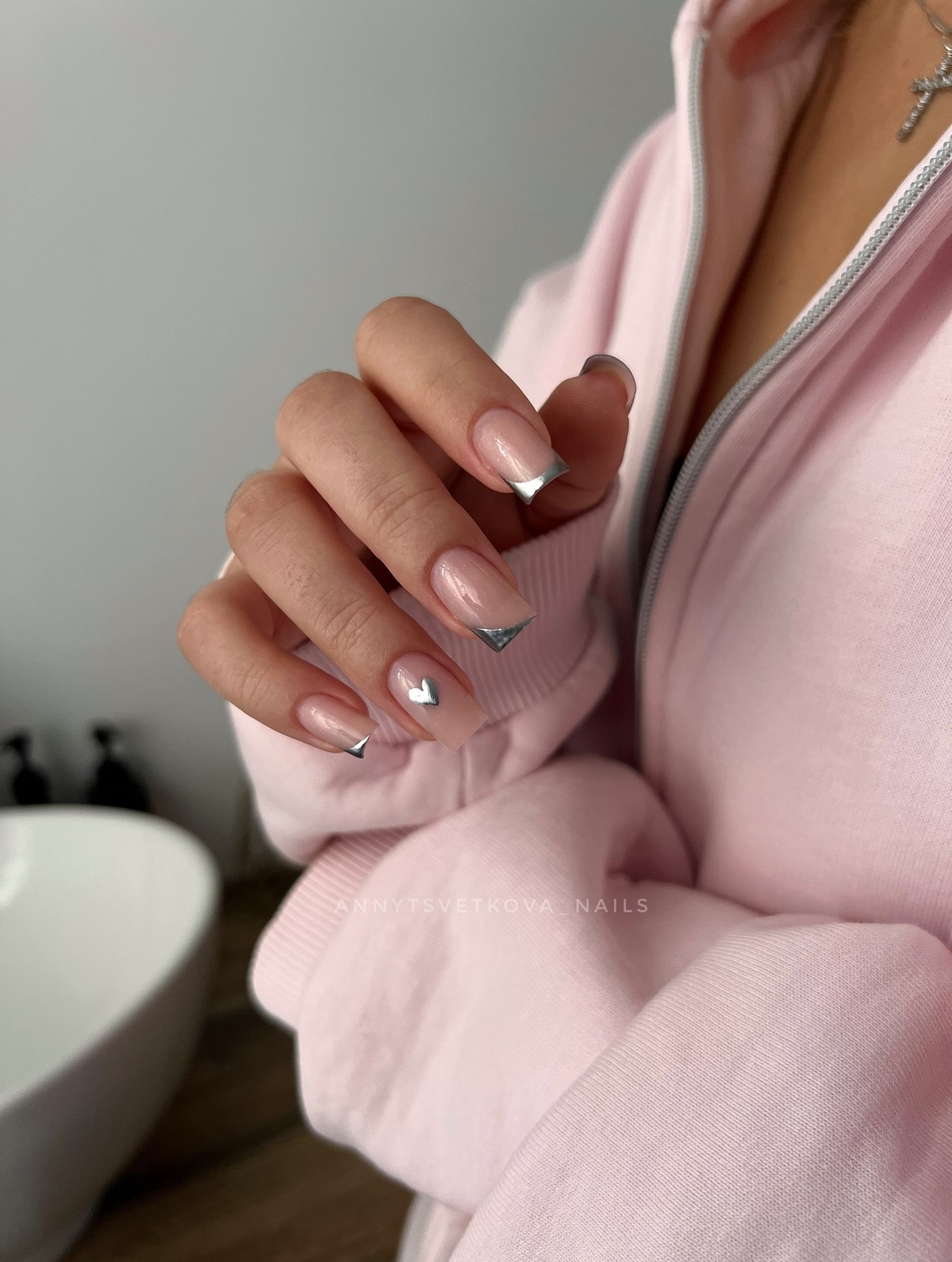 Такой дизайн отлично сочетается с холодными оттенками основы, молочным, серым или прозрачным нюдом. Серебряное сердце не перегружает маникюр и добавляет ему статусности и модного характера.