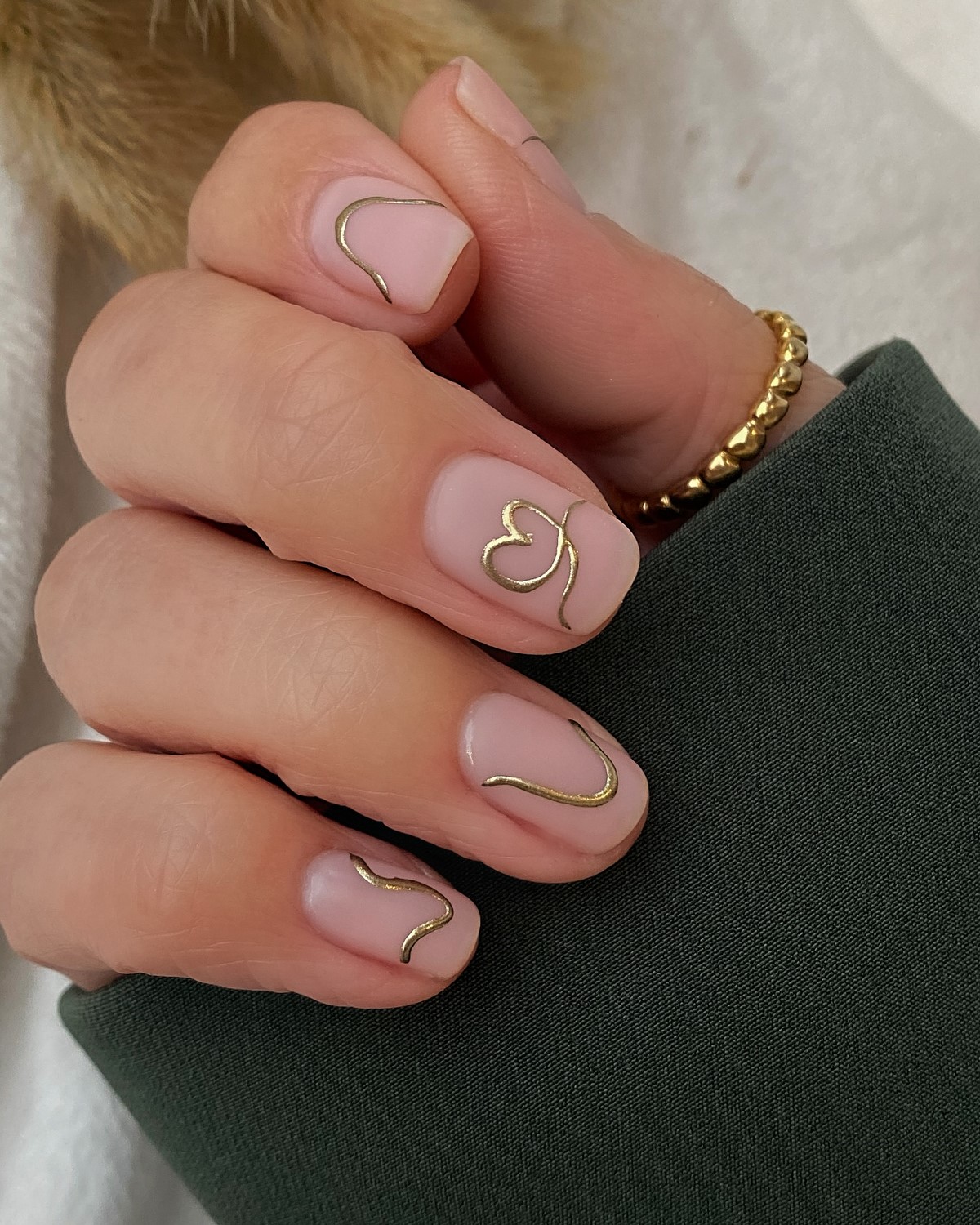 Матовая поверхность в сочетании с золотыми деталями становится одним из самых эффектных решений сезона. В этом варианте все ногти украшены тонкой золотой линией, а на одном пальце эта линия формирует сердце, словно сотканное из золотой нити.