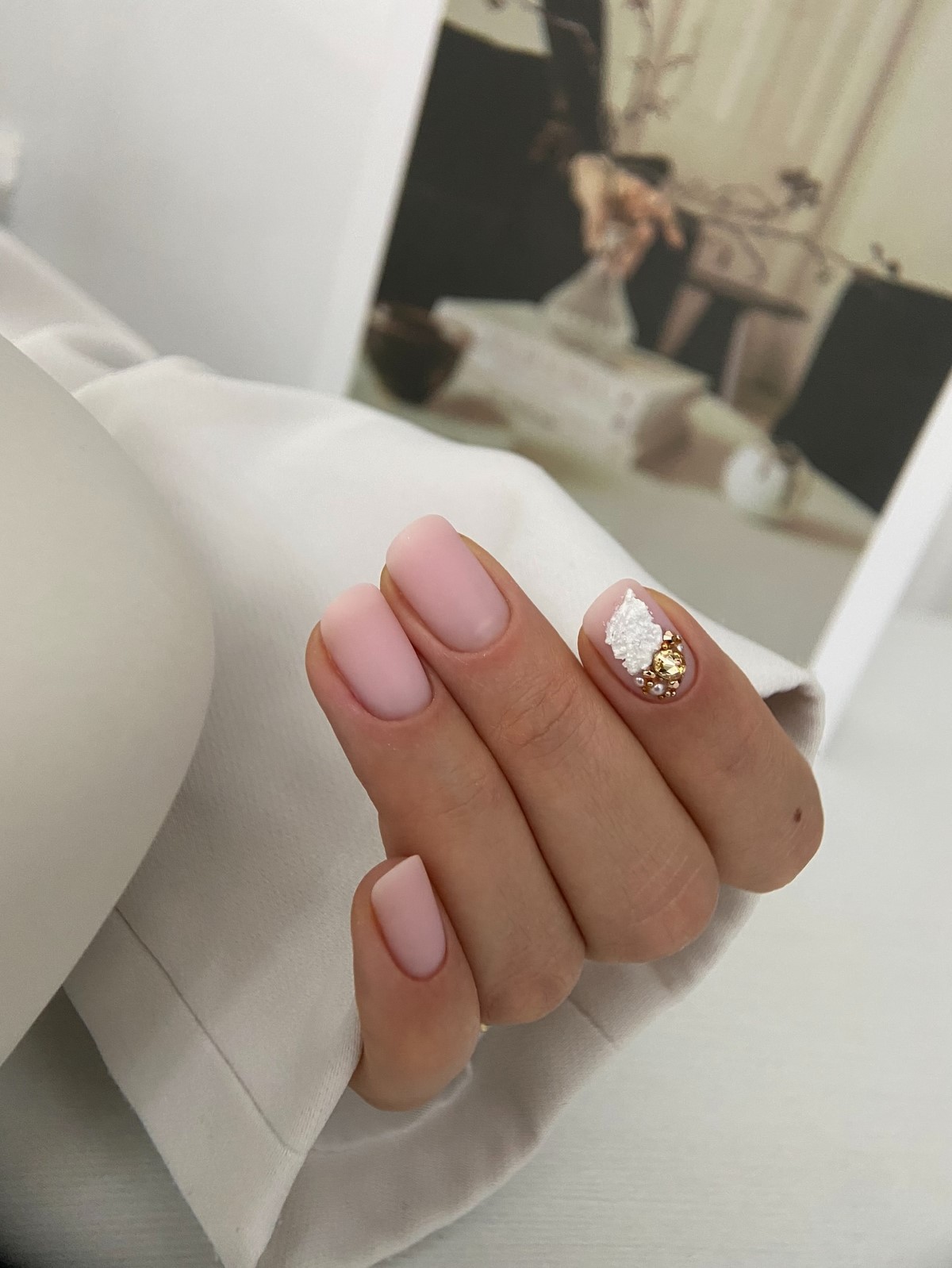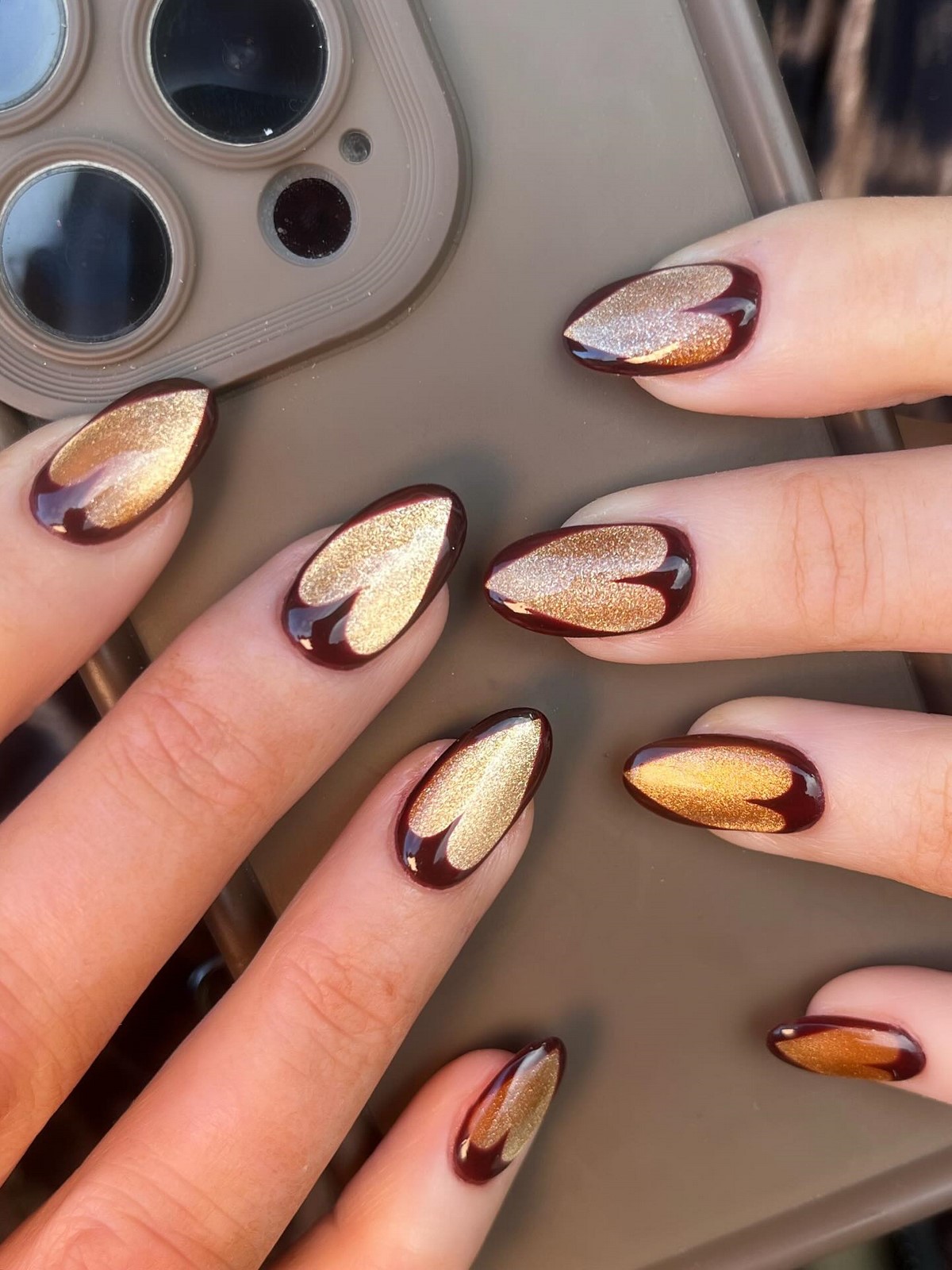 Такой дизайн подходит как для коротких, так и для средних ногтей, визуально вытягивает пластину и делает маникюр более статусным. В моде приглушенное золото без резкого блеска, с бархатным финишем.