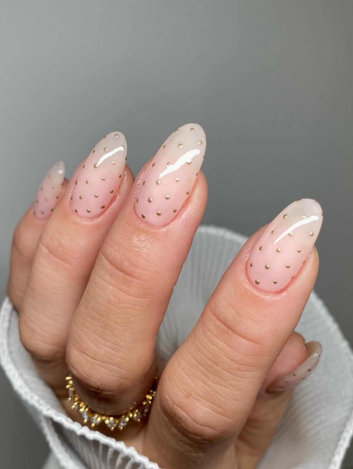 Золотые точки могут быть разного размера или располагаться асимметрично, что добавляет динамики и визуального интереса. Такой дизайн выглядит игриво, но при правильном подборе оттенков остается элегантным и уместным даже в строгом образе.