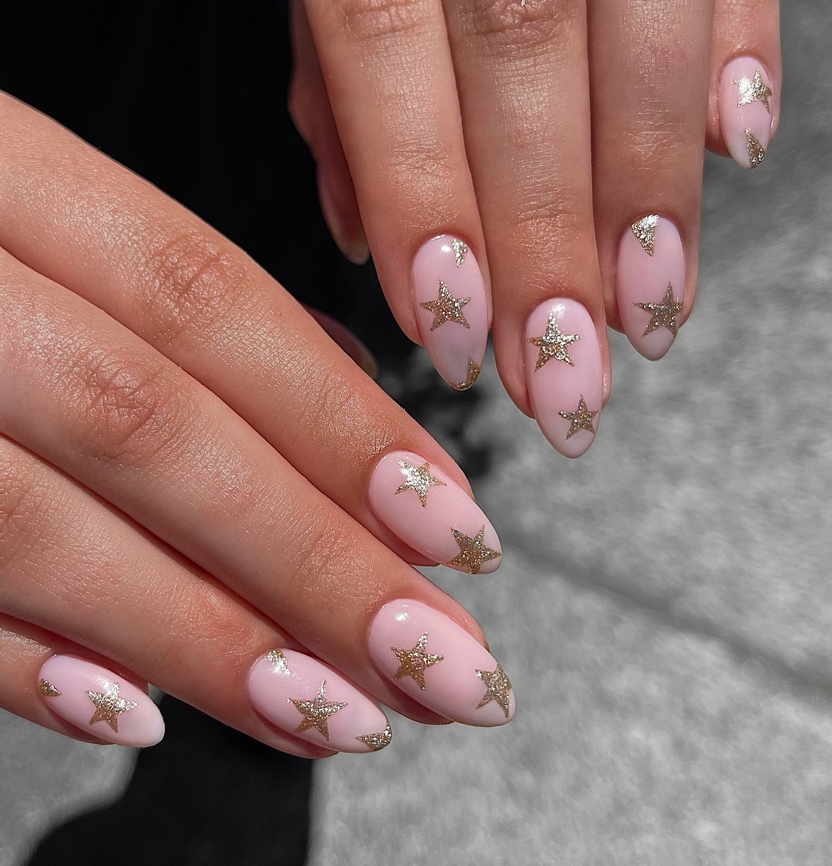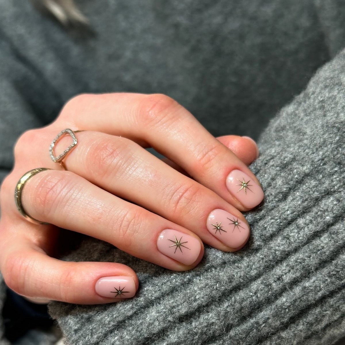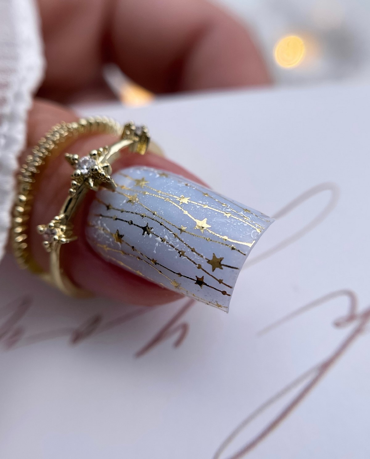 Звезды могут быть одиночными акцентами или частью минималистичной композиции. Особенно эффектно они смотрятся на прозрачной или молочной базе, создавая ощущение легкости и воздушности.