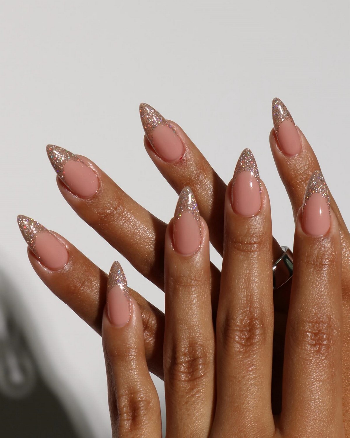 Золотые блестки, растянутые в градиенте, выглядят особенно уместно в середине зимы. Такой маникюр сохраняет праздничное настроение, но выглядит более спокойно и повседневно, чем плотное покрытие глиттером.