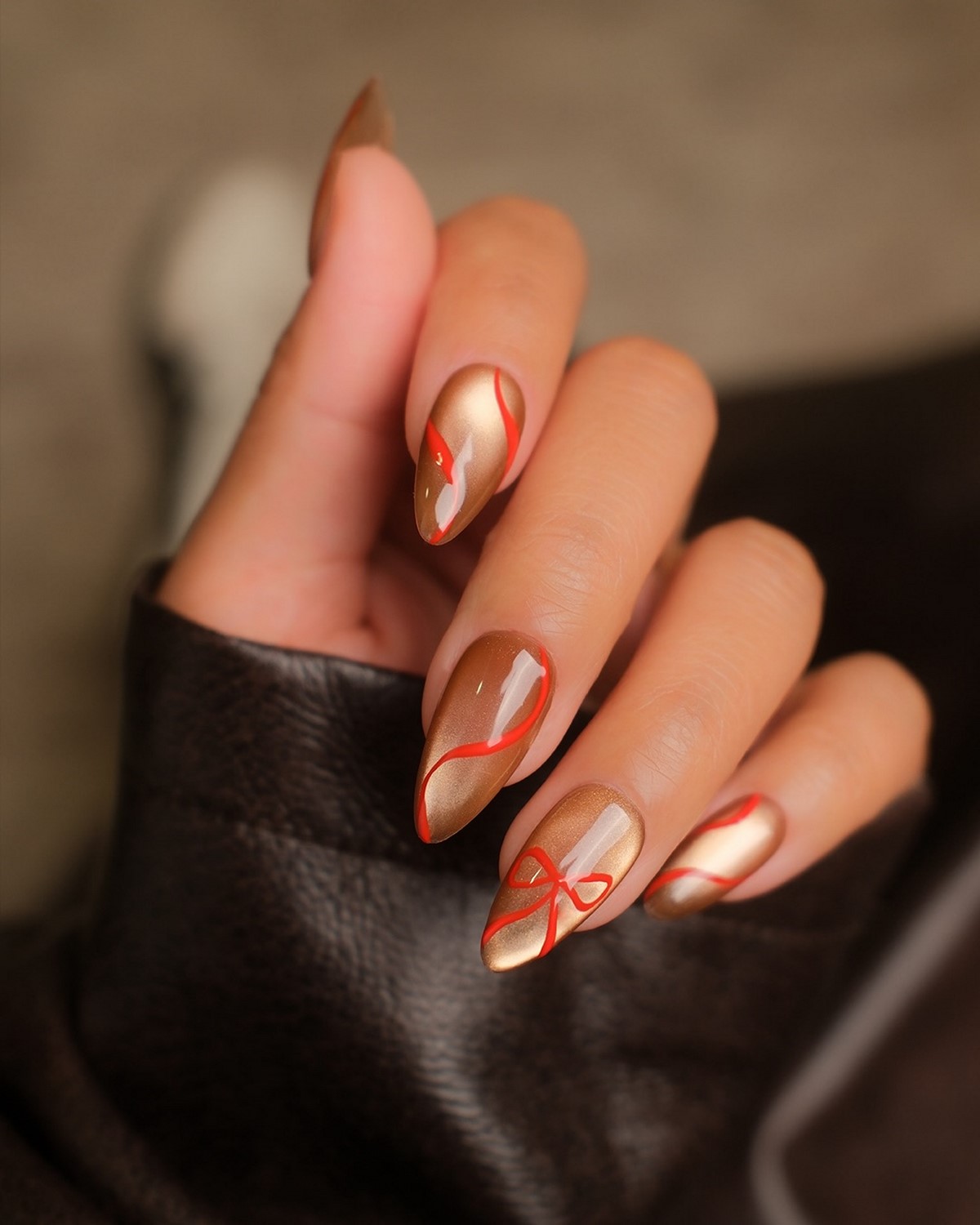 Золото в январском маникюре выглядит благородно, мягко и продуманно. Оно не спорит с уютными образами, вязаными фактурами и спокойной цветовой палитрой, а наоборот подчеркивает женственность и аккуратность. В 2026 году золотые мотивы приобретают более тонкое и дизайнерское звучание, уходя от избыточного блеска к элегантным деталям.