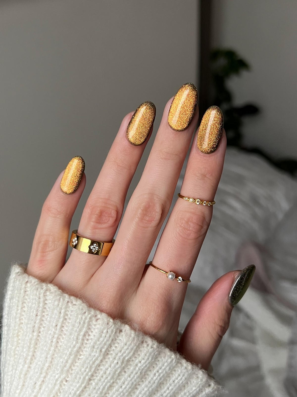 Эффект кошачьего глаза с золотым переливом в январе 2026 становится одним из самых выразительных решений. Глубокие темные базы в сочетании с мягким золотым сиянием создают эффект внутреннего света, который особенно красиво смотрится при искусственном освещении.