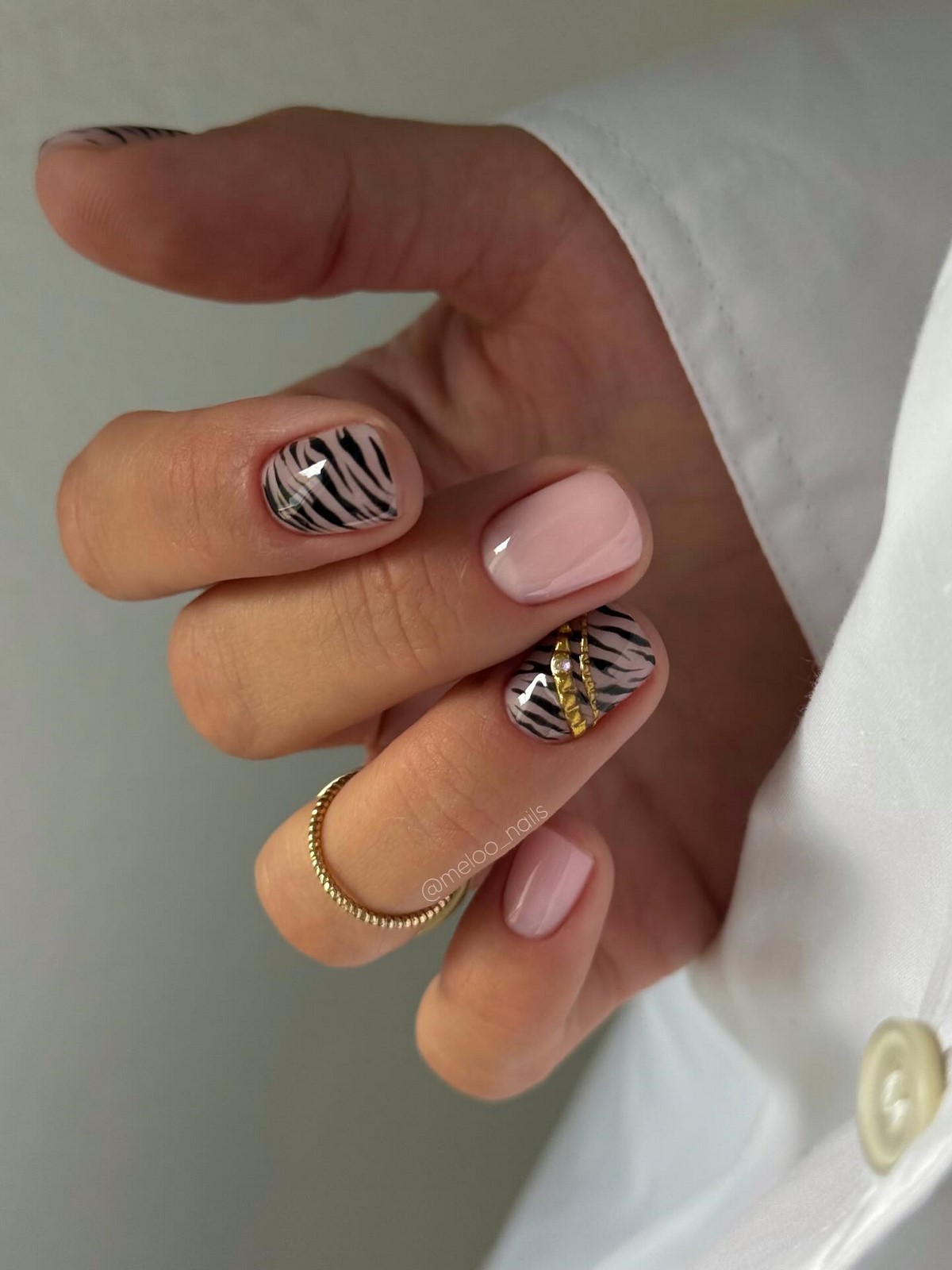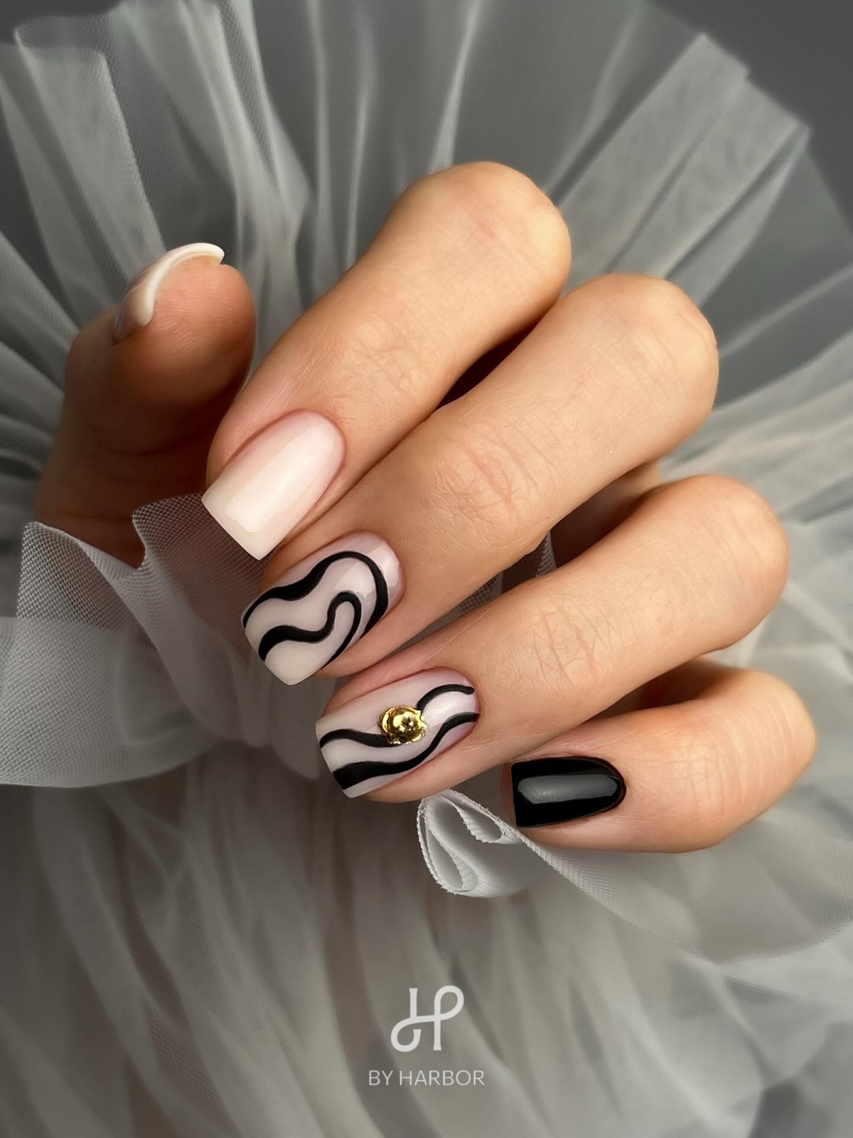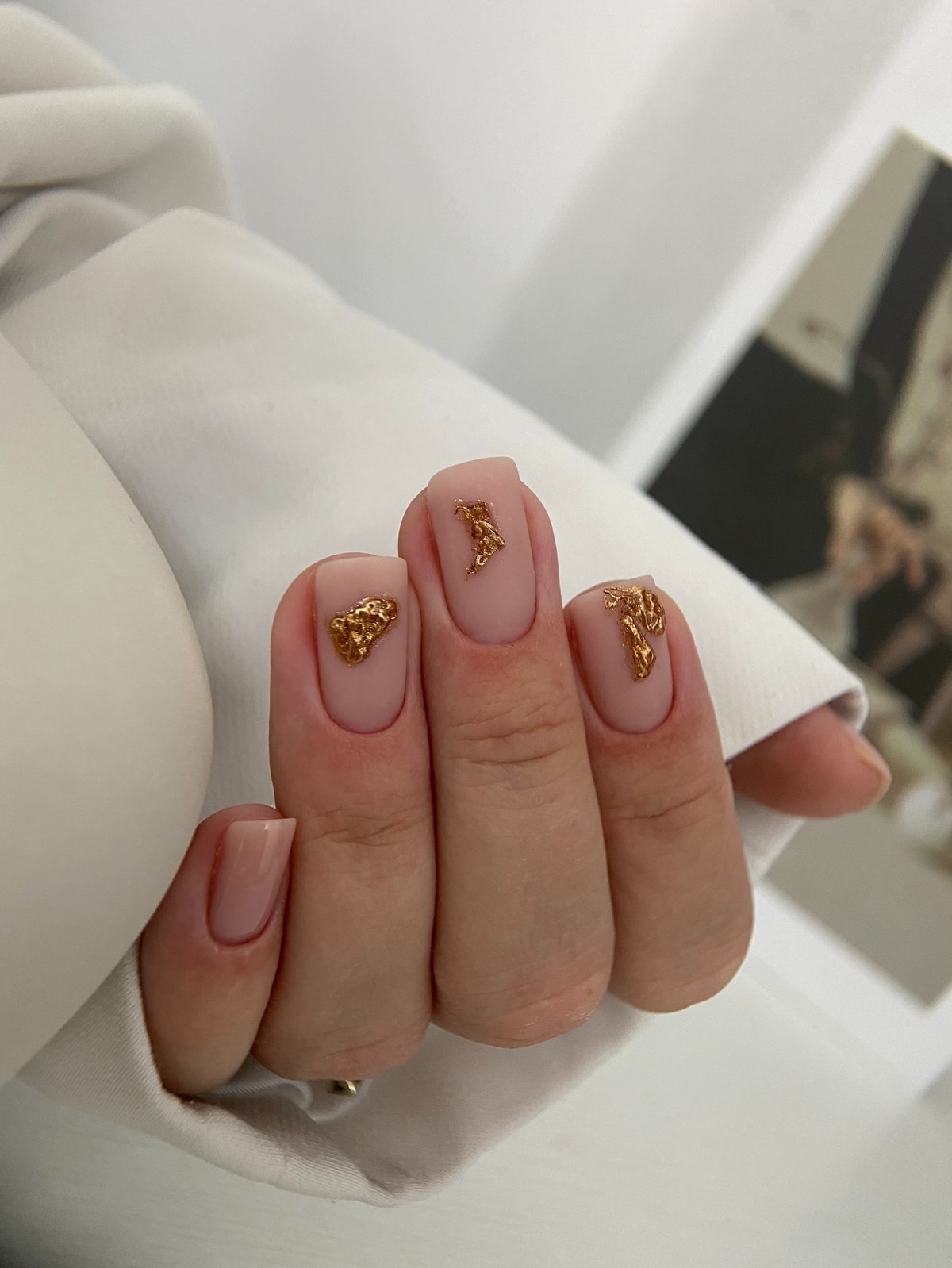 Тонкие линии, аккуратные точки и геометрические акценты в золоте отлично сочетаются с молочными, серыми и бежевыми оттенками. Это идеальный вариант для тех, кто ценит сдержанность и современную эстетику.