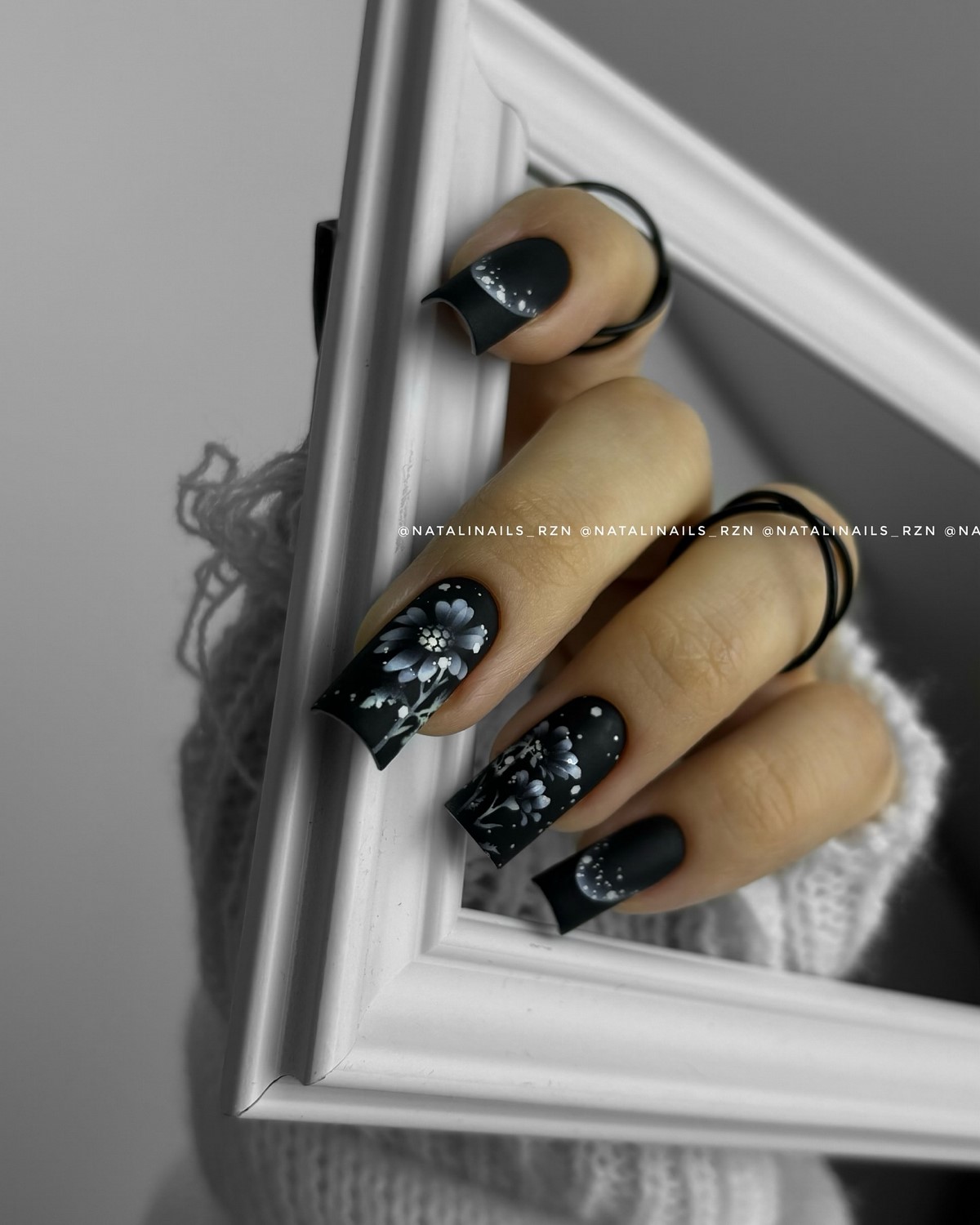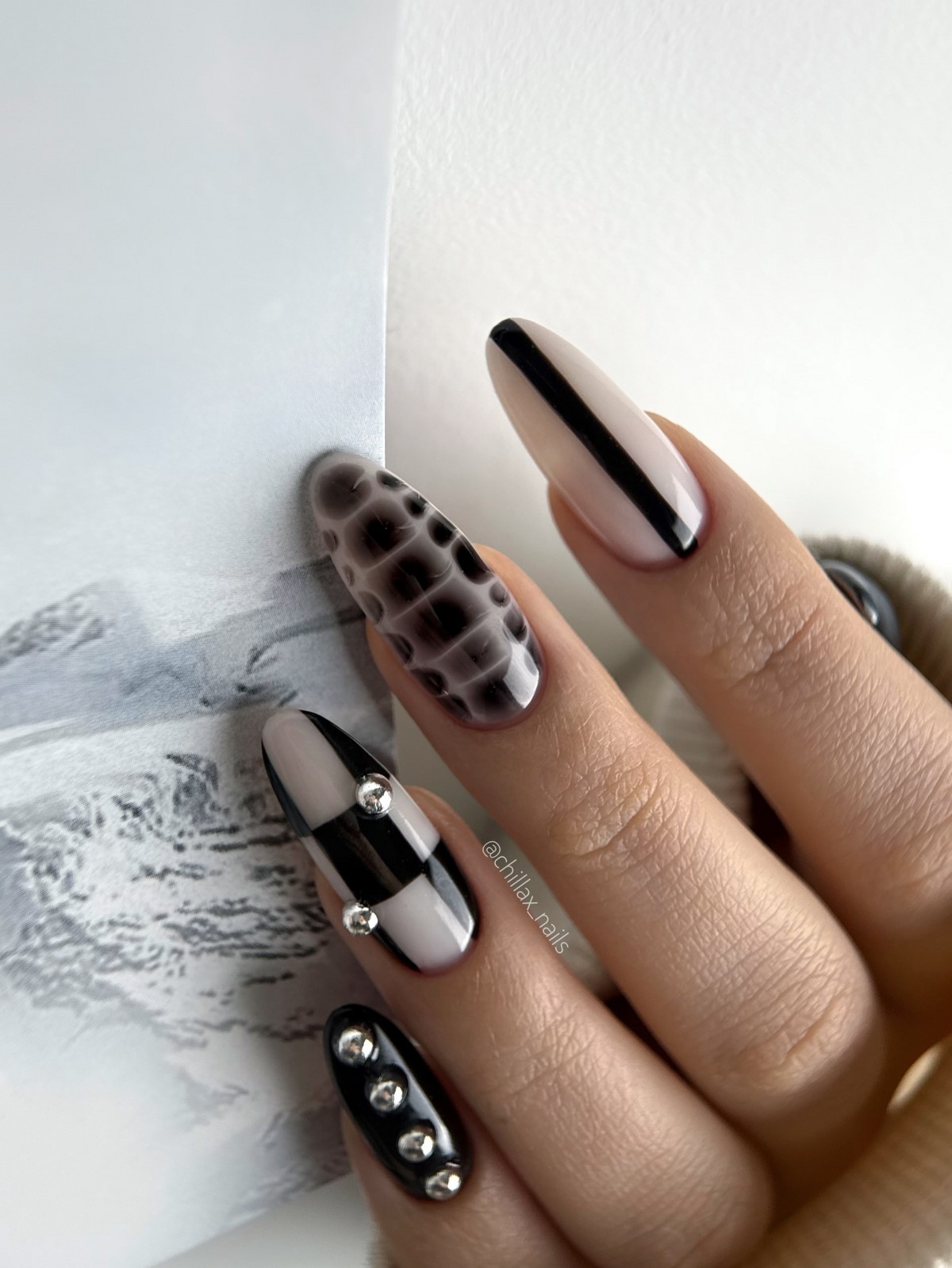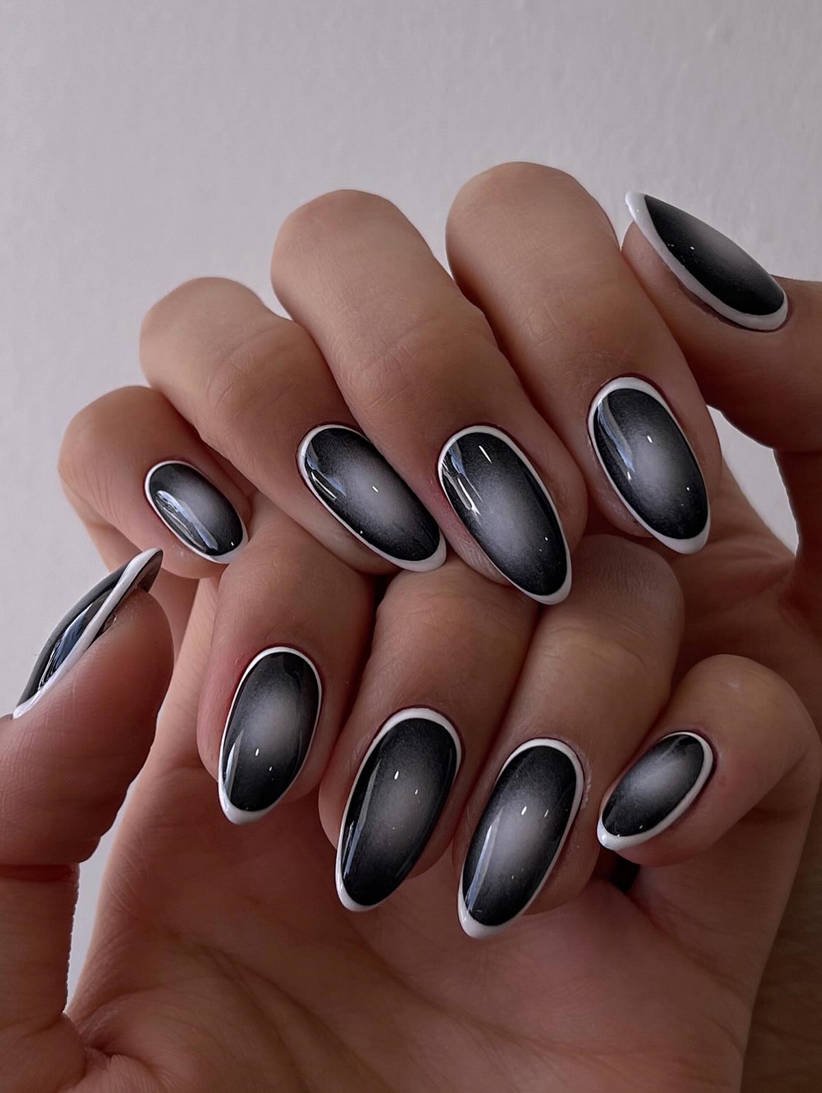 В феврале 2026 особенно популярны мягкие, размытые границы и легкий дымчатый эффект. Черно-белая аура подходит как для длинных, так и для коротких ногтей, добавляя им визуальной легкости.