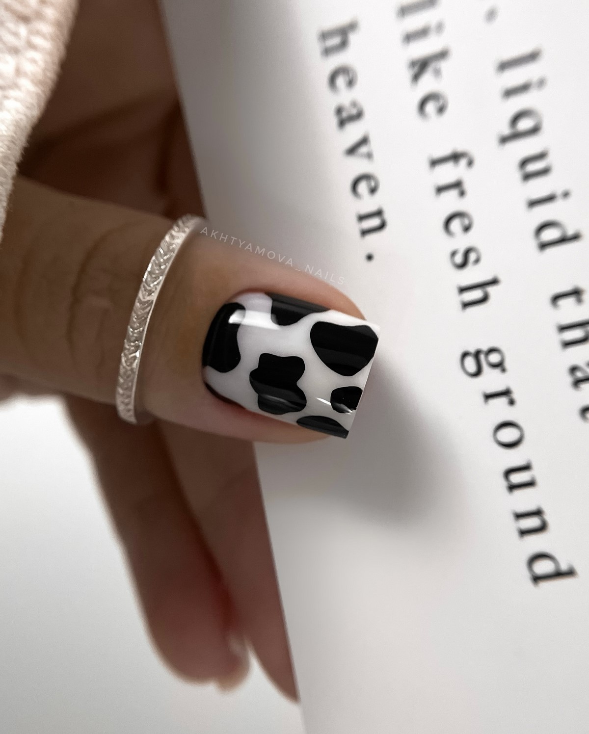 В феврале 2026 коровий принт часто используют дозированно. Например, на одном или двух ногтях, сочетая его с однотонным черным покрытием. Это делает дизайн более универсальным и современным.