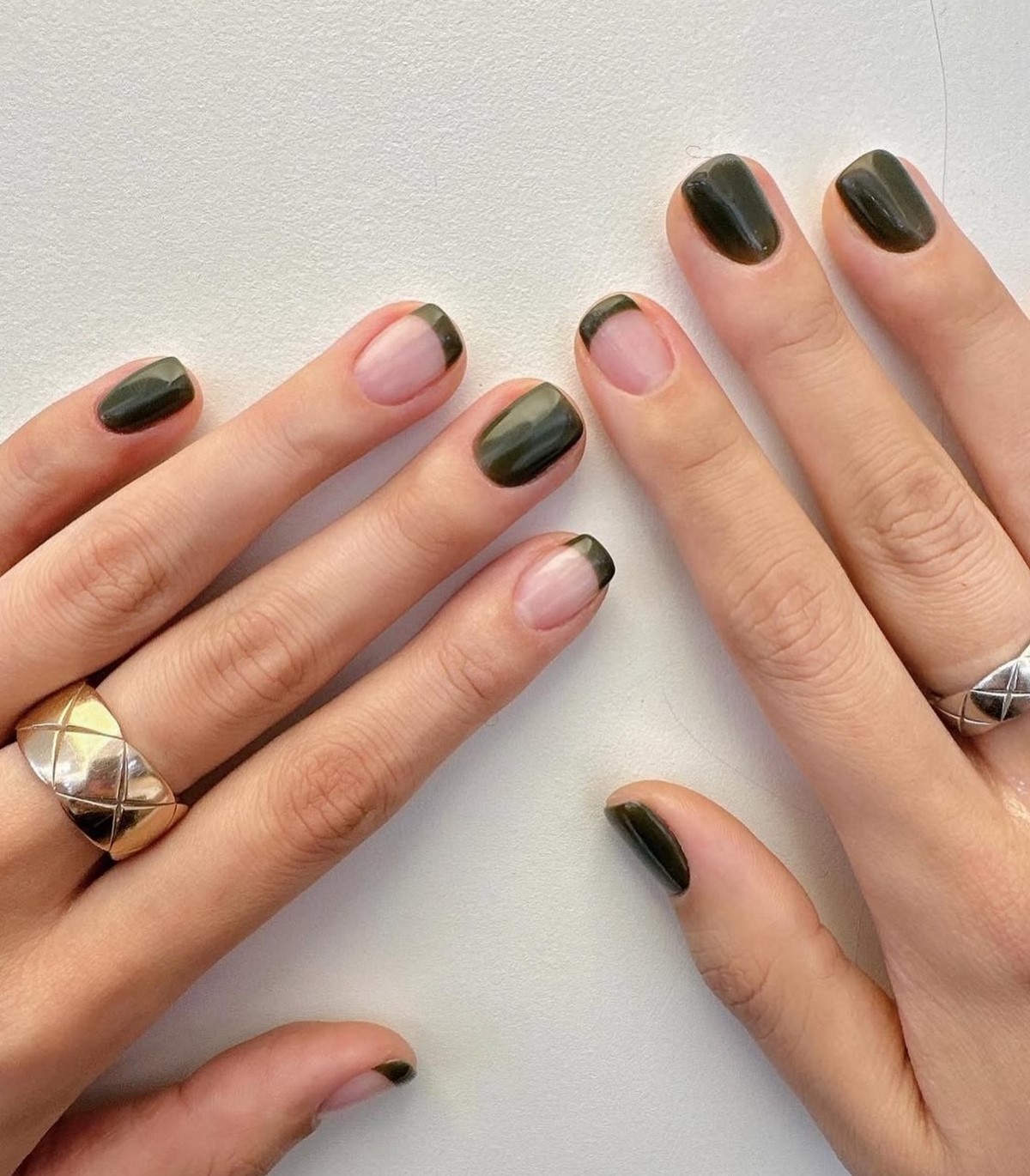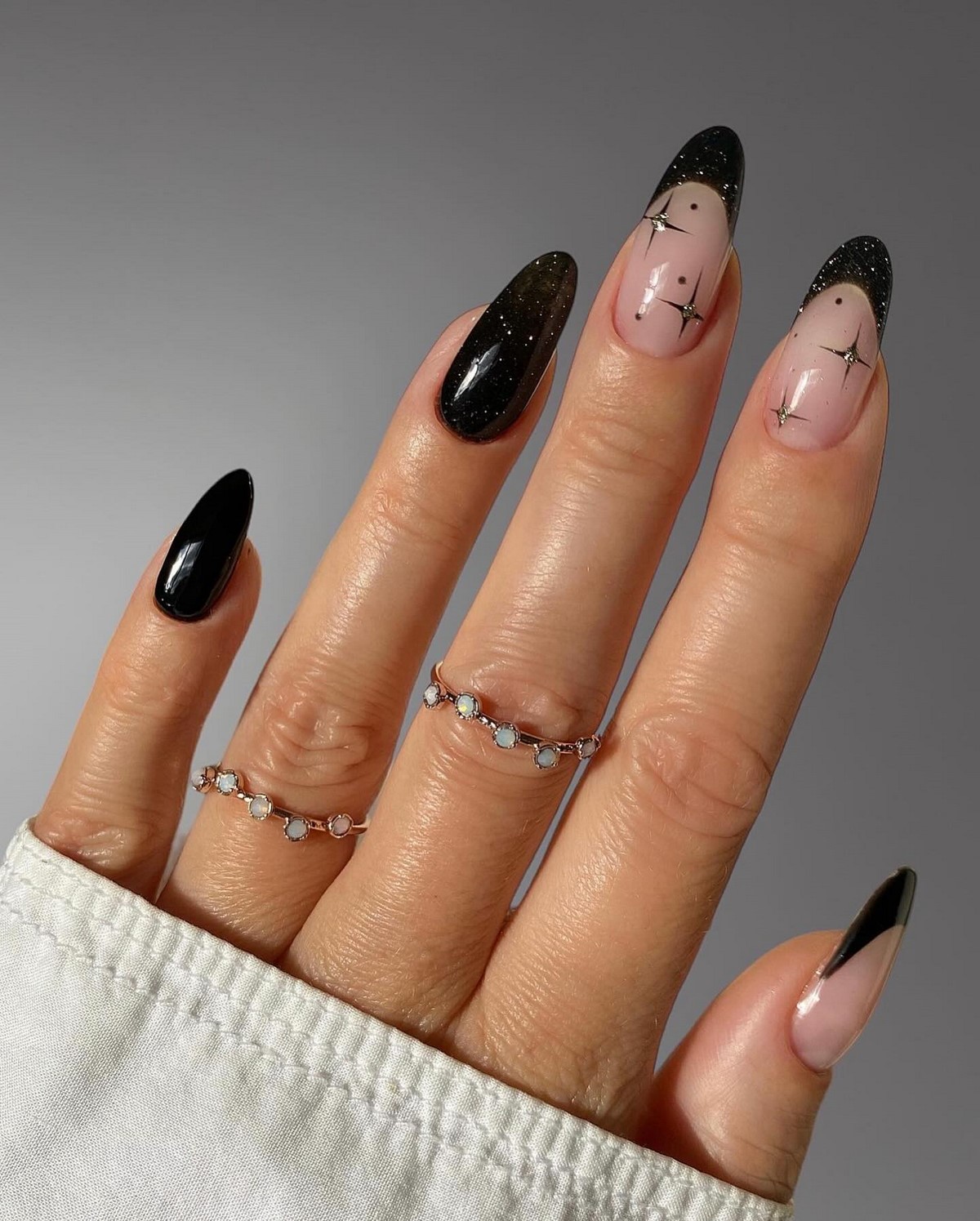 Черный френч все чаще дополняют микроблеском, тонкими серебряными линиями или асимметричными кончиками. Это придает дизайну современное звучание и делает его уместным даже для праздничных образов.