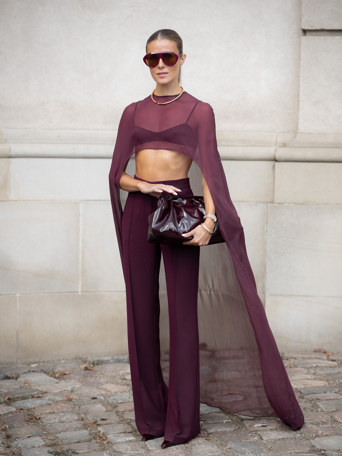 Богатый сливовый оттенок сочетает в себе элегантность фиолетового и теплоту красного. Этот сложный цвет идеально подходит для создания вечерних и деловых образов, добавляя им изысканности и глубины. Сливовый прекрасно гармонирует с серым, черным и кремовыми оттенками.