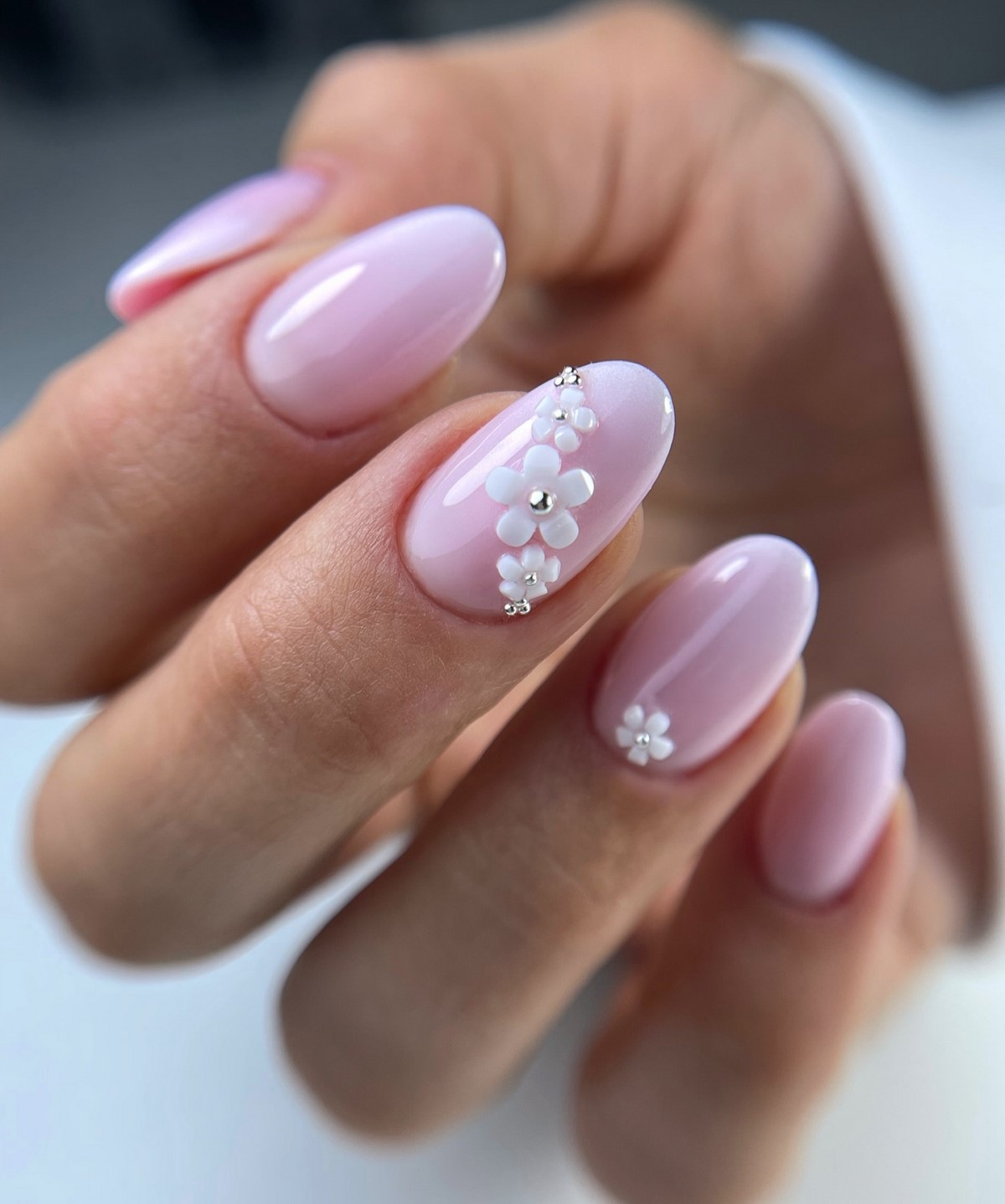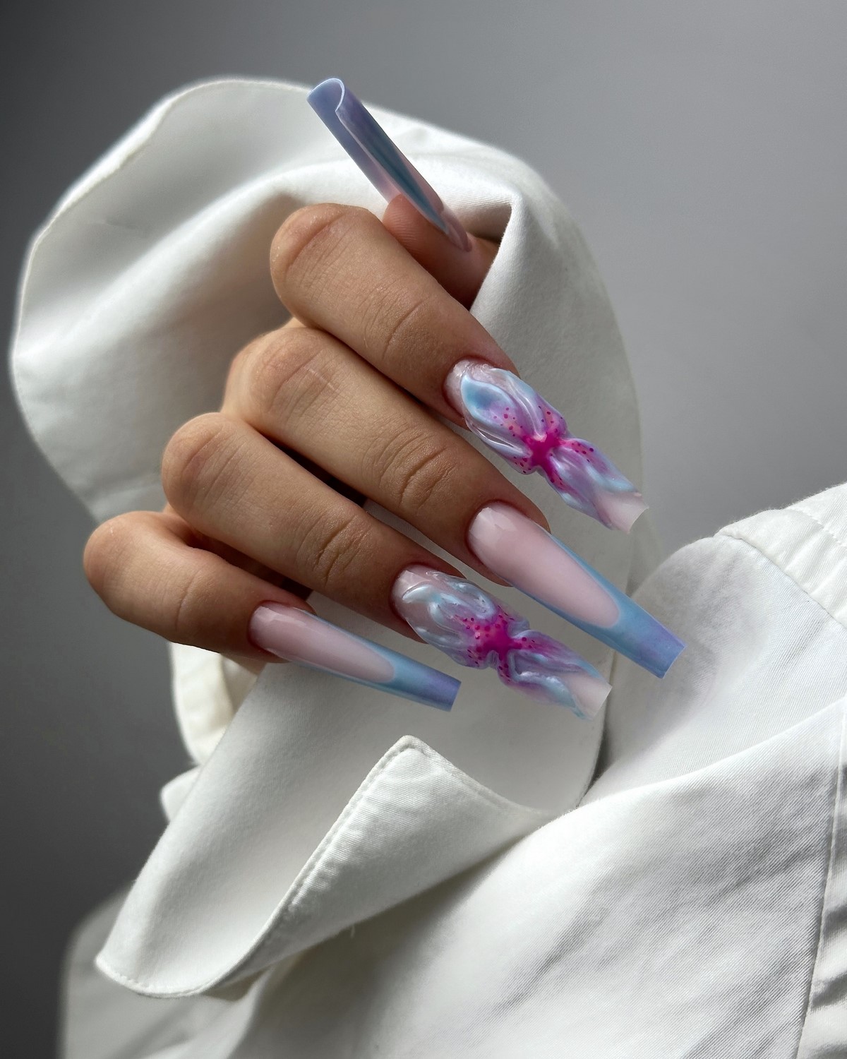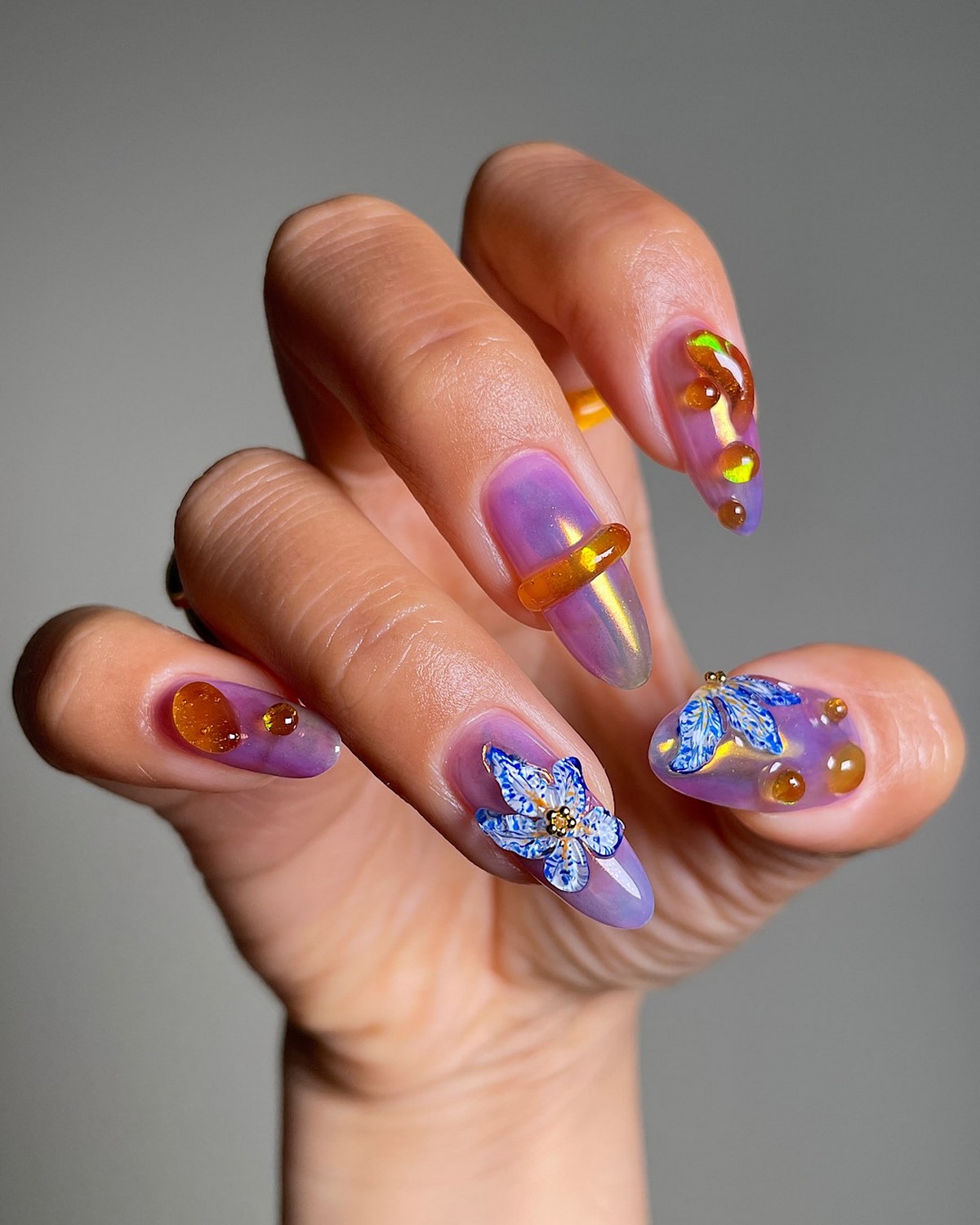 Трехмерные элементы из акрила или геля создают скульптурные композиции на ногтях. От миниатюрных цветов до абстрактных форм — объем добавляет драматичности образу.