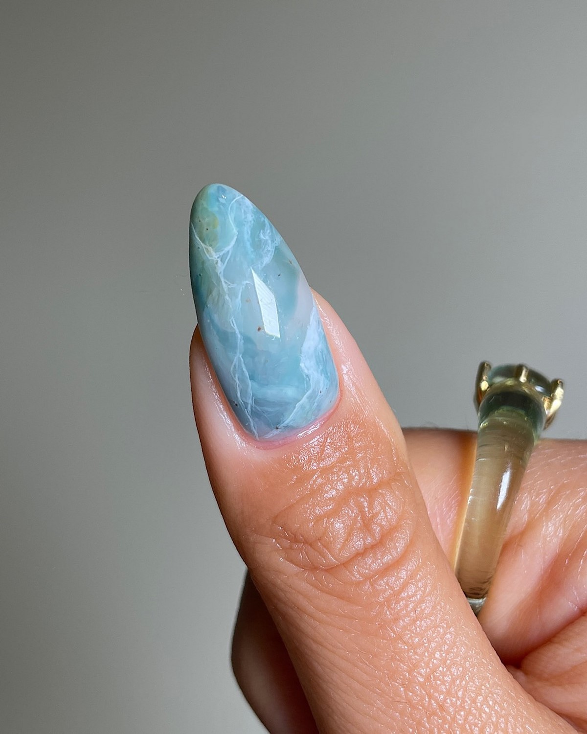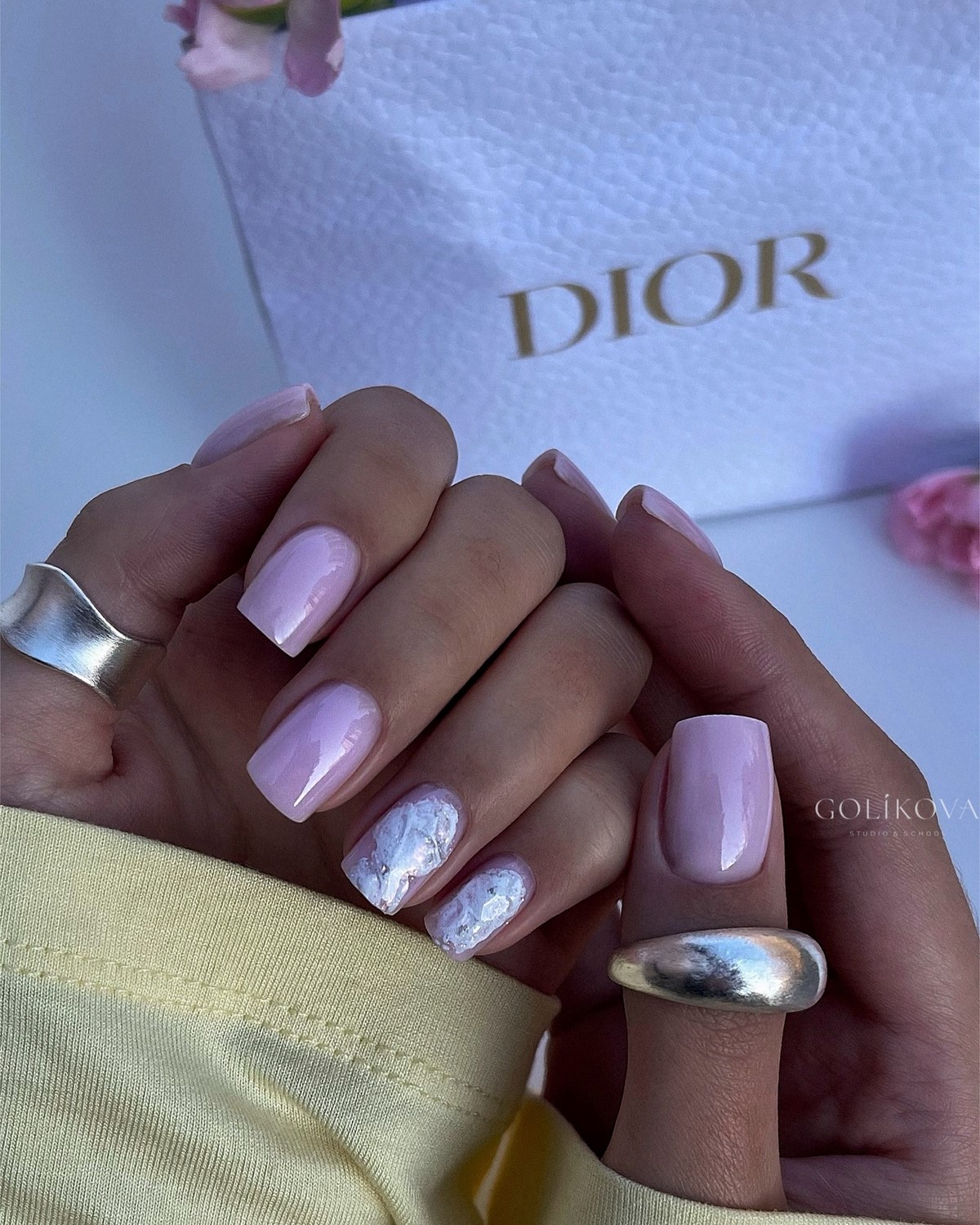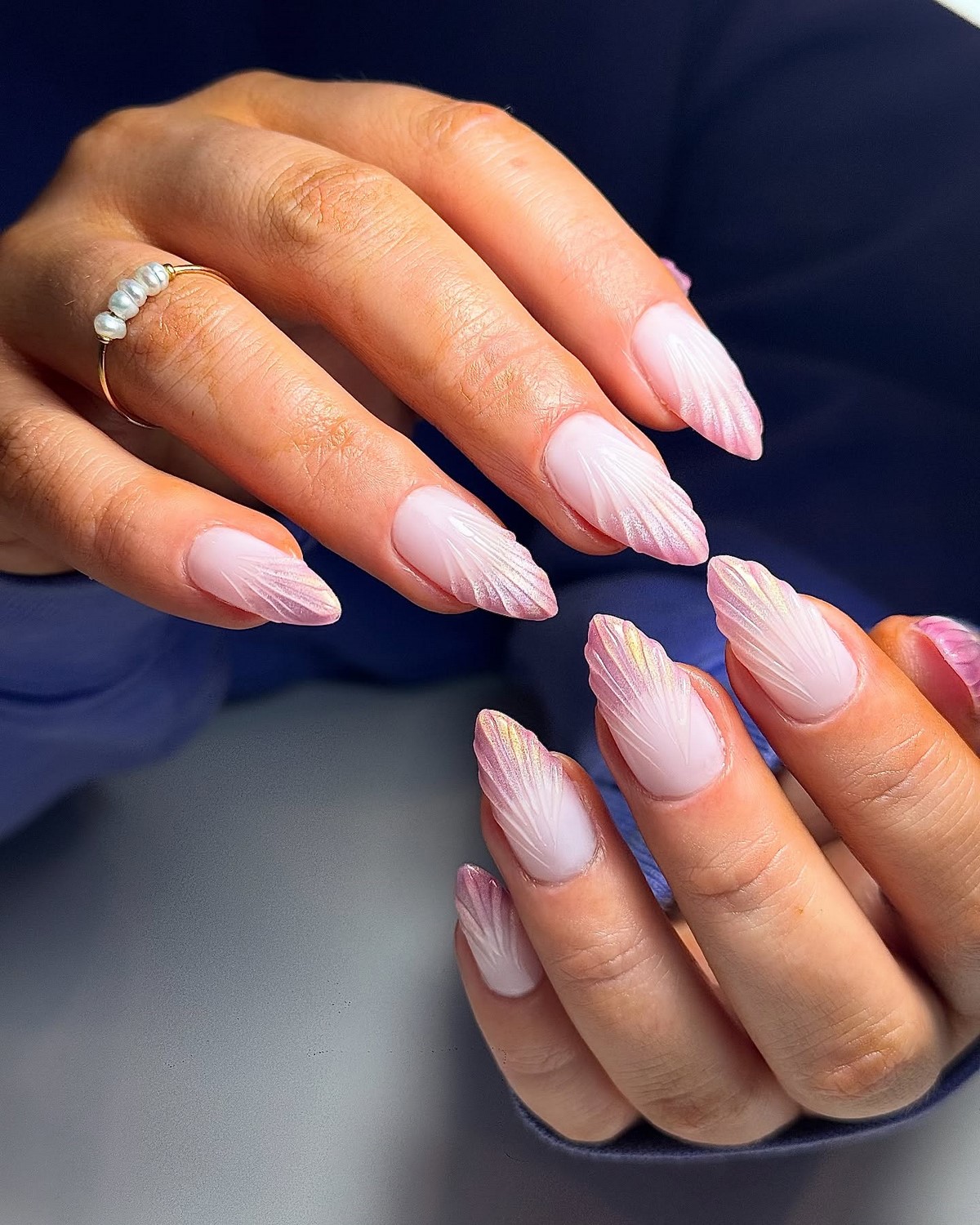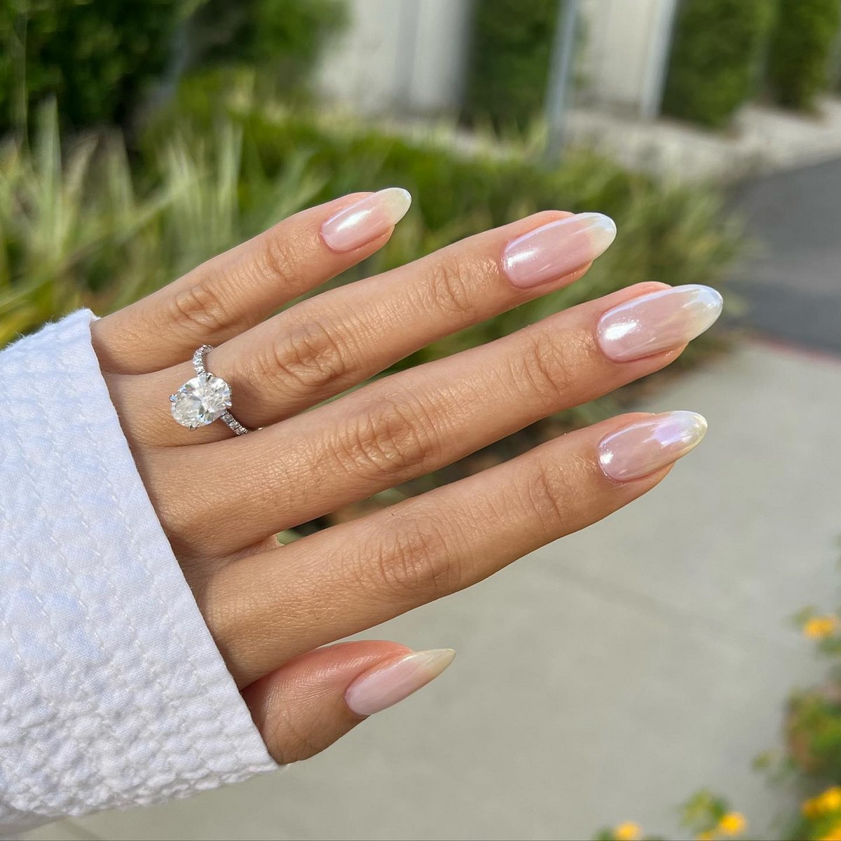 Эффект сияющего ореола вокруг кутикулы создается при помощи перламутровых пигментов и специальных техник растушевки. Этот тренд символизирует внутренний свет и положительную энергию, идеально подходя для летних образов.