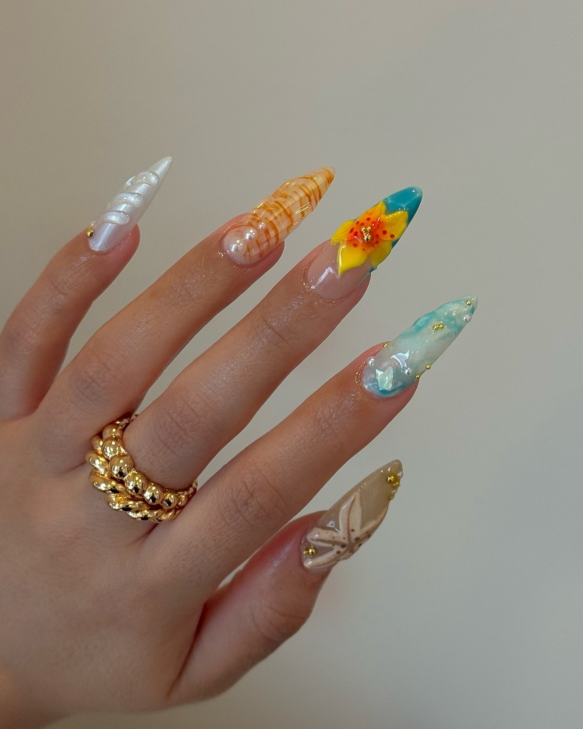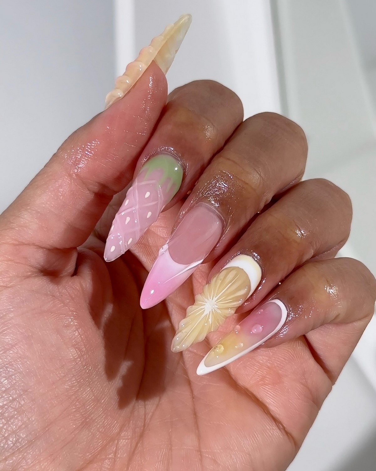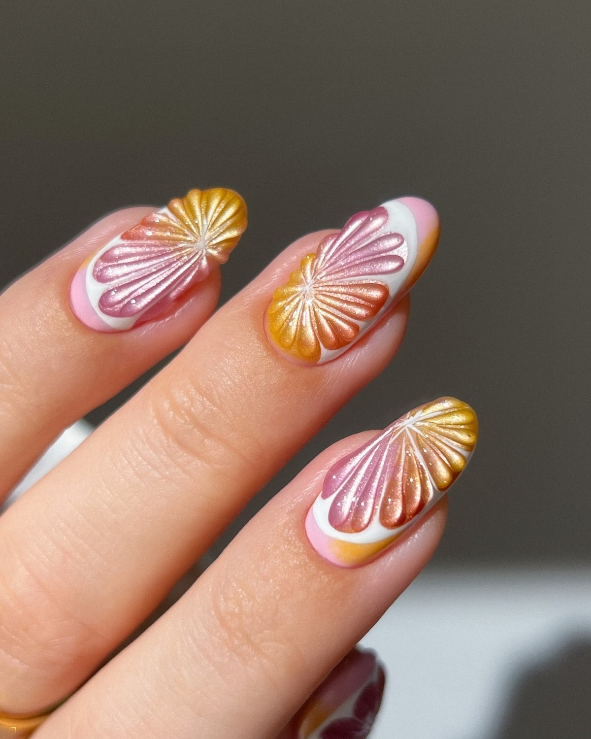 Яркие рисунки тропических фруктов — от арбузов до манго — превращают ногти в миниатюрную выставку летнего изобилия. Техника требует детальной прорисовки и ярких акриловых красок.