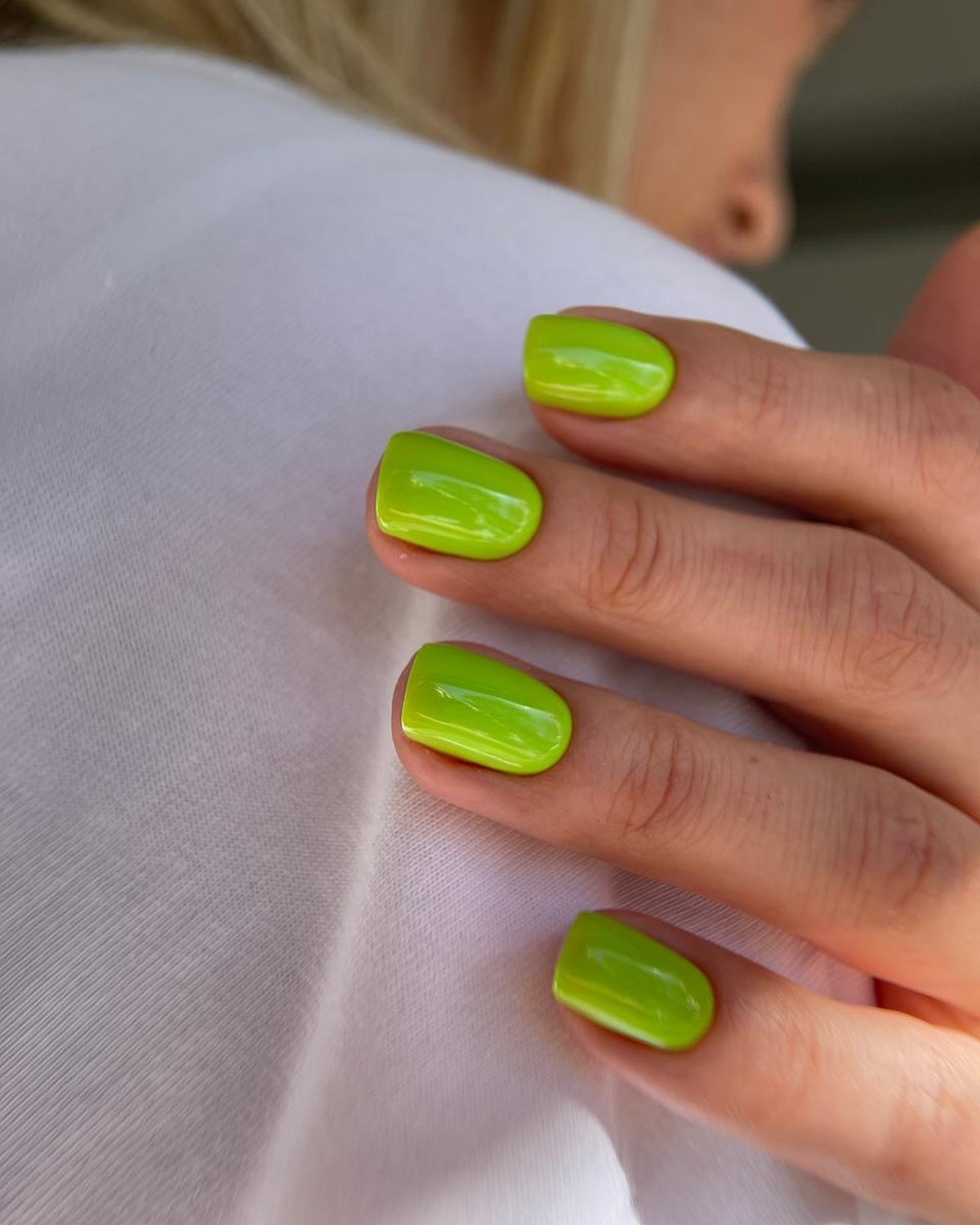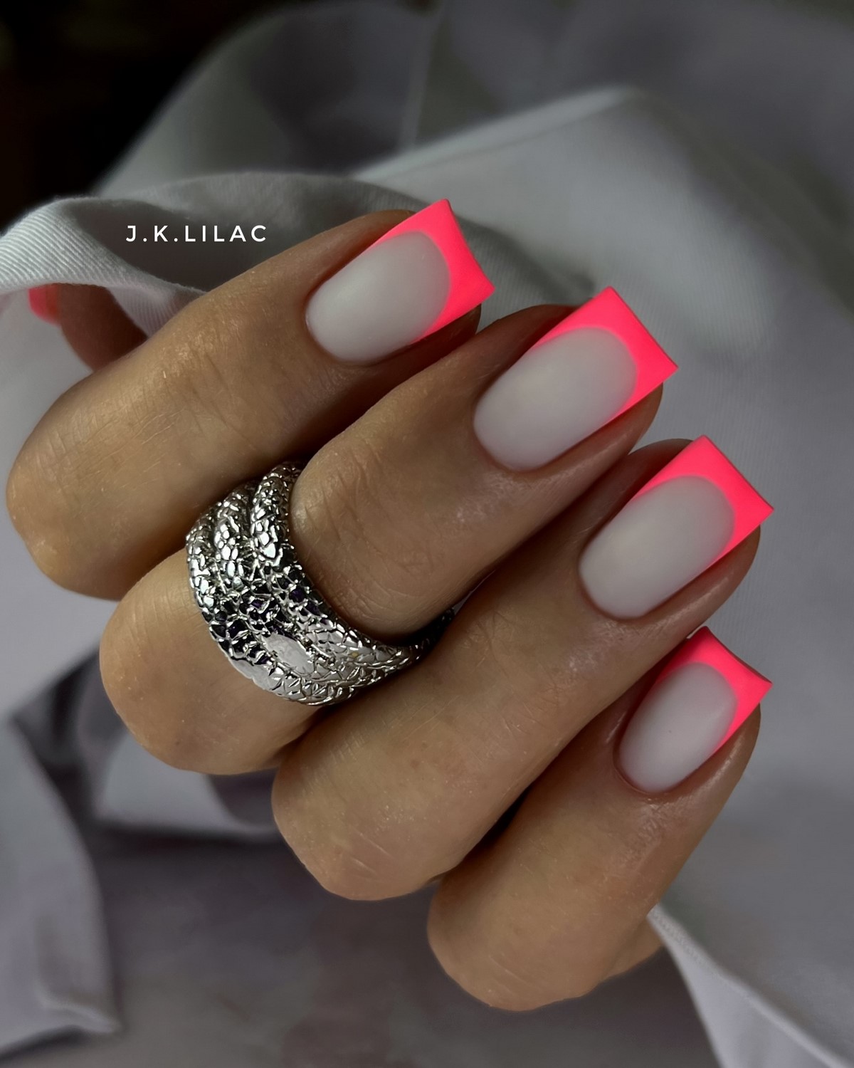 Насыщенные неоновые оттенки — от электрического розового до кислотно-зеленого — доминируют в летней палитре 2025. Такой маникюр привлекает внимание и подчеркивает смелость обладательницы.