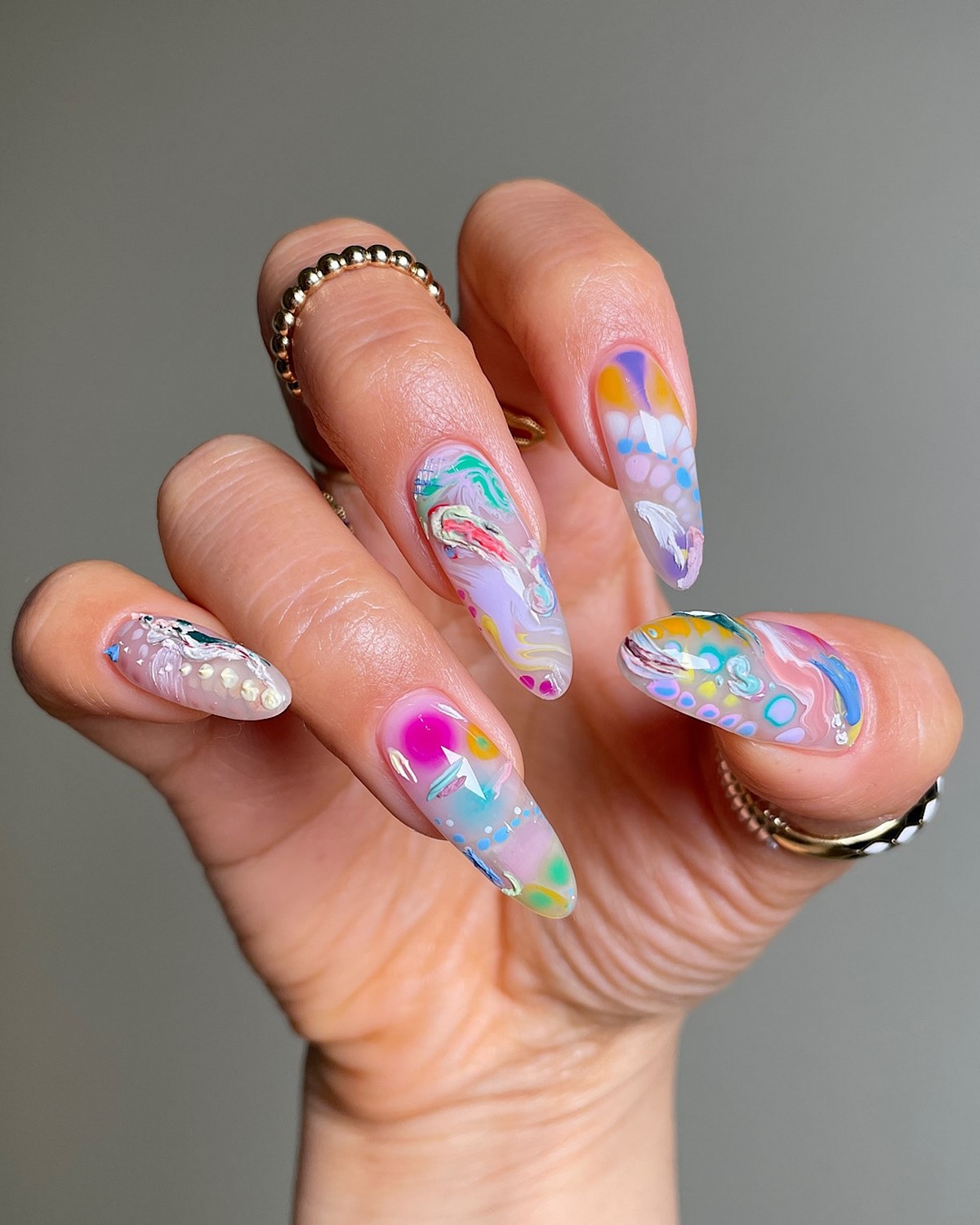 Полупрозрачные покрытия, имитирующие желе или стекло, создают эффект «съедобных» ногтей. Техника требует использования специальных прозрачных гелей с цветными пигментами.