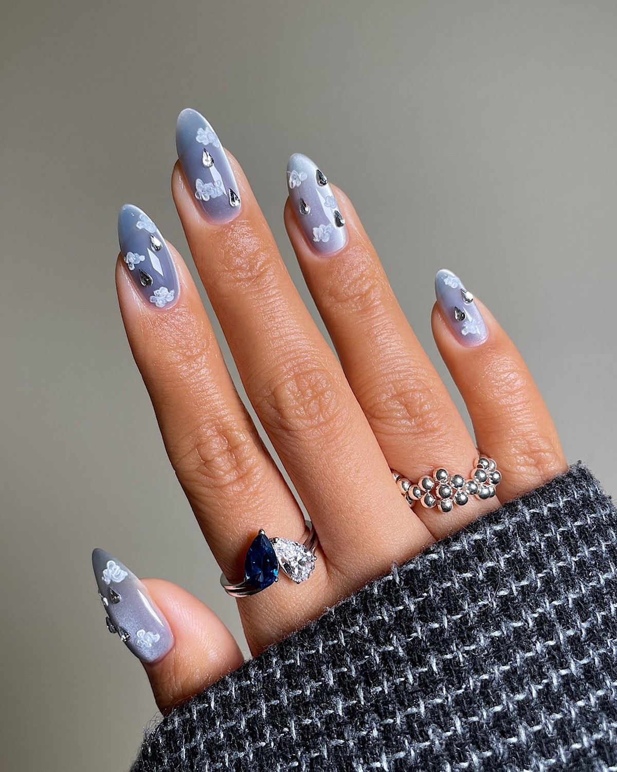 Кристаллы различных размеров и форм создают роскошные акценты. Современные тенденции предполагают асимметричное размещение и комбинирование разных оттенков страз.