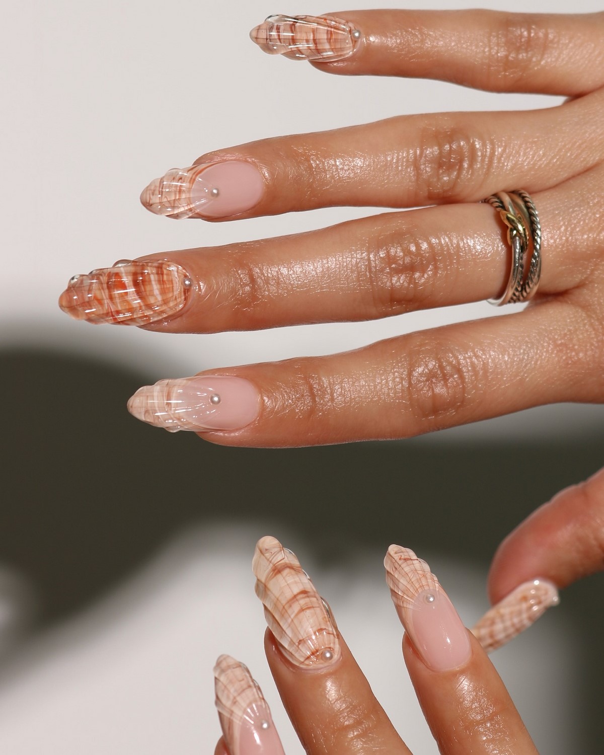 Комбинация рельефных поверхностей с жемчужными вкраплениями создает роскошный эффект. Мастера используют специальные гели и микробисер для достижения уникального тактильного опыта.
